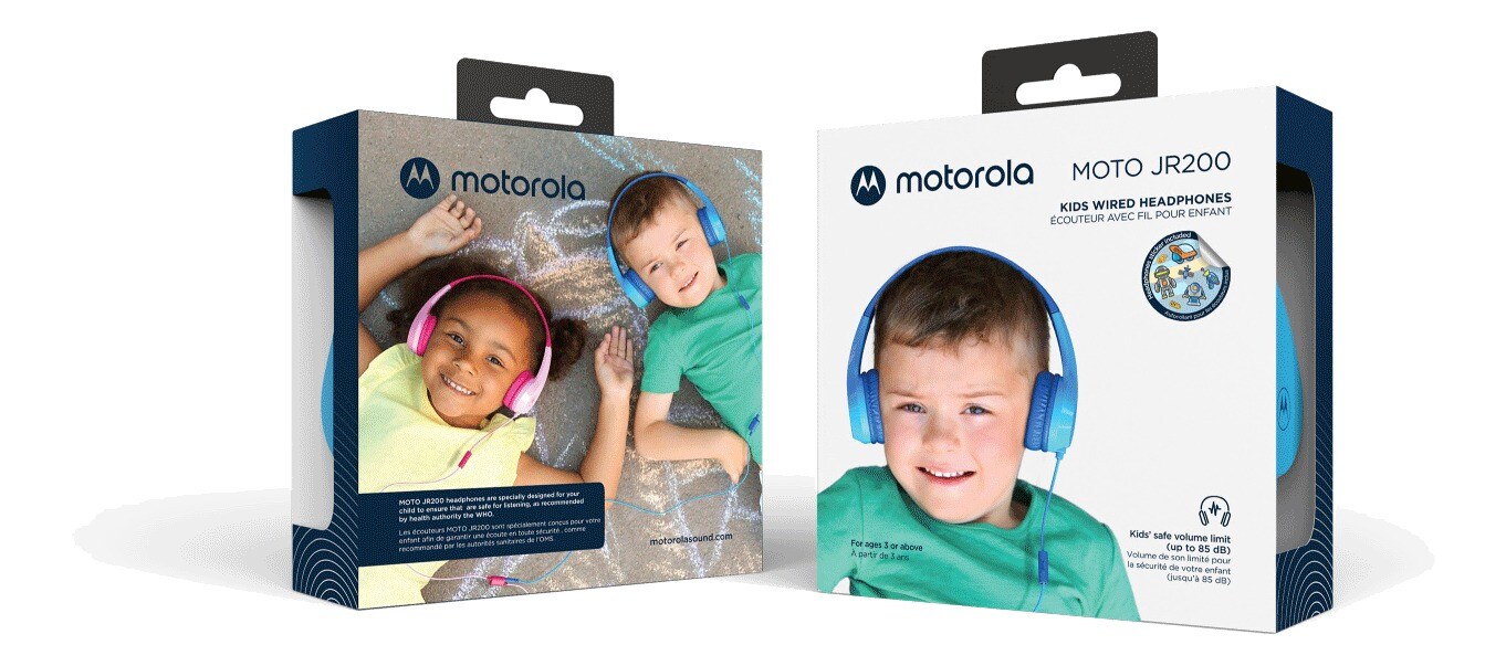 Motorolan on-ear kuulokkeet lapsille. Kuulokkeiden äänenvoimakkuustaso on 85 desibeliä ja niiden kokoa voidaan säätää, joten ne sopivat myös lapsen kasvaessa. Kuulokkeet voidaan helposti liittää älypuhelimeen tai tablettiin mukana toimitetulla metrin pituisella 3,5 mm:n kaapelilla, jossa on sisäänrakennettu mikrofoni.