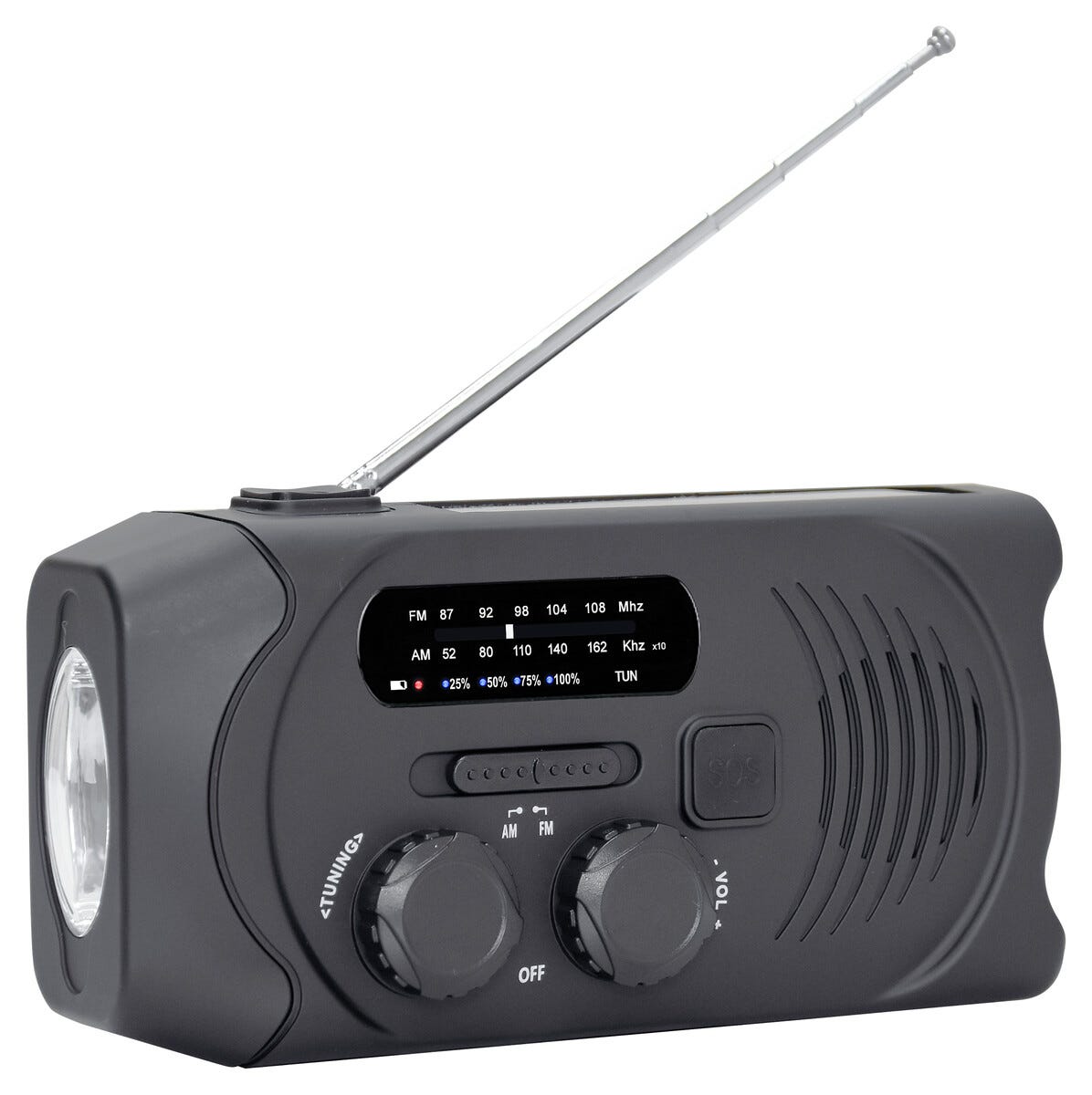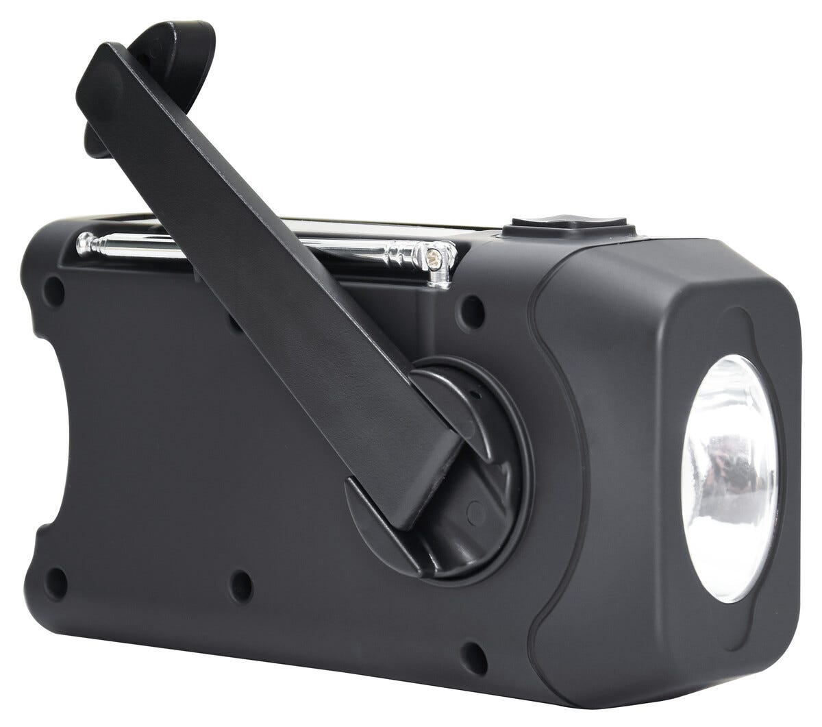 - Ladataan veivillä, aurinkokennolla tai USB-kaapelilla<br />