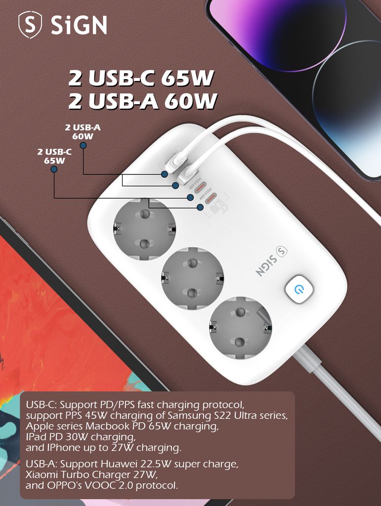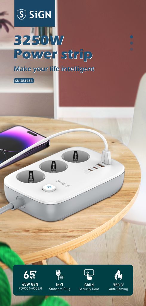 621423-osainen jatkopistorasia GaN 65W 2 x USB-C + 2 x USB-A 2 m Valkoinenhttps://www.phonelife.fi/laturit-kaapelit/lisavarusteet-latureille-ja-kaapeleille/3-osainen-jatkopistorasia-gan-65w-2-x-usb-c-2-x-usb-a-2-m-valkoinen?channelCountry=FIhttps://www.phonelife.fi/pub_images/original/0_-_-_5_-_-_SE3436_E6_BF_80_E5_85_89_E6_95_88_E6_9E_9C_E5_9B_BE_20_283_29_281_29_xNWYzAuoEbv1xko3G4pCe.jpgInStock30.95EUR/laturit-kaapelit/lisavarusteet-latureille-ja-kaapeleilleSiGN<p>Tehokas ja kompakti GaN-jatkopistorasia SiGN-merkiltä, joka yhdistää nopean latauksen ja älykkään muotoilun kotiin, toimistolle tai matkalle. Kolmen pistorasian sekä kahden USB-A- ja kahden USB-C-portin ansiosta voit ladata useita laitteita samanaikaisesti helposti ja tehokkaasti. GaN-teknologia mahdollistaa korkean suorituskyvyn pienemmällä lämmöntuotolla, mikä takaa vakaan ja turvallisen latauksen myös suuremmalla kuormituksella. Jopa 65 W kokonaislatausteho tekee tästä jatkopistorasiasta ihanteellisen kannettaville tietokoneille, tableteille, älypuhelimille ja muille elektronisille laitteille. Käytännöllinen 2 metrin kaapeli antaa joustavuutta sijoitteluun ja auttaa luomaan siistin ja modernin latauspisteen arkeen. Tyylikäs ja tilaa säästävä ratkaisu nykyaikaisiin lataustarpeisiin.</p>
