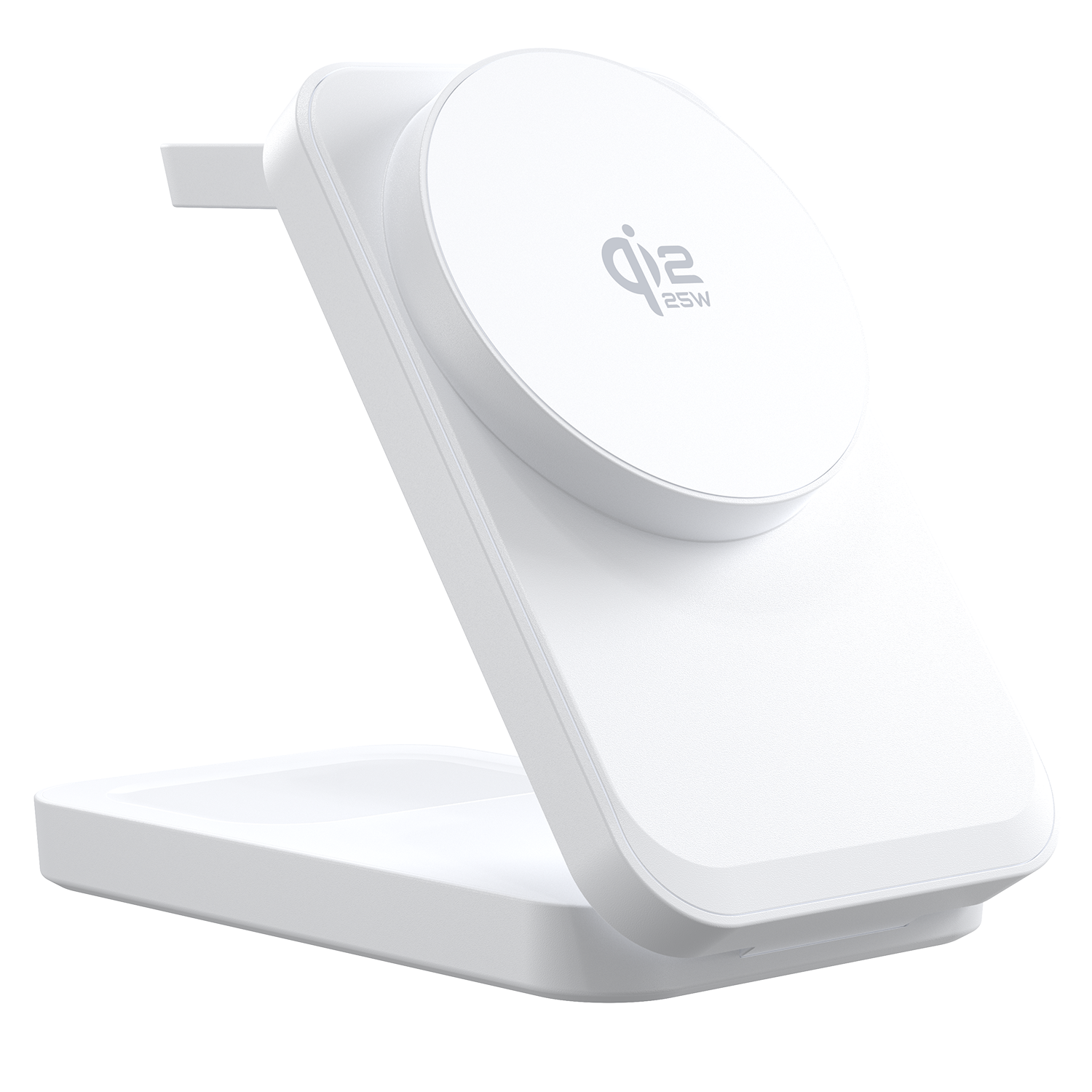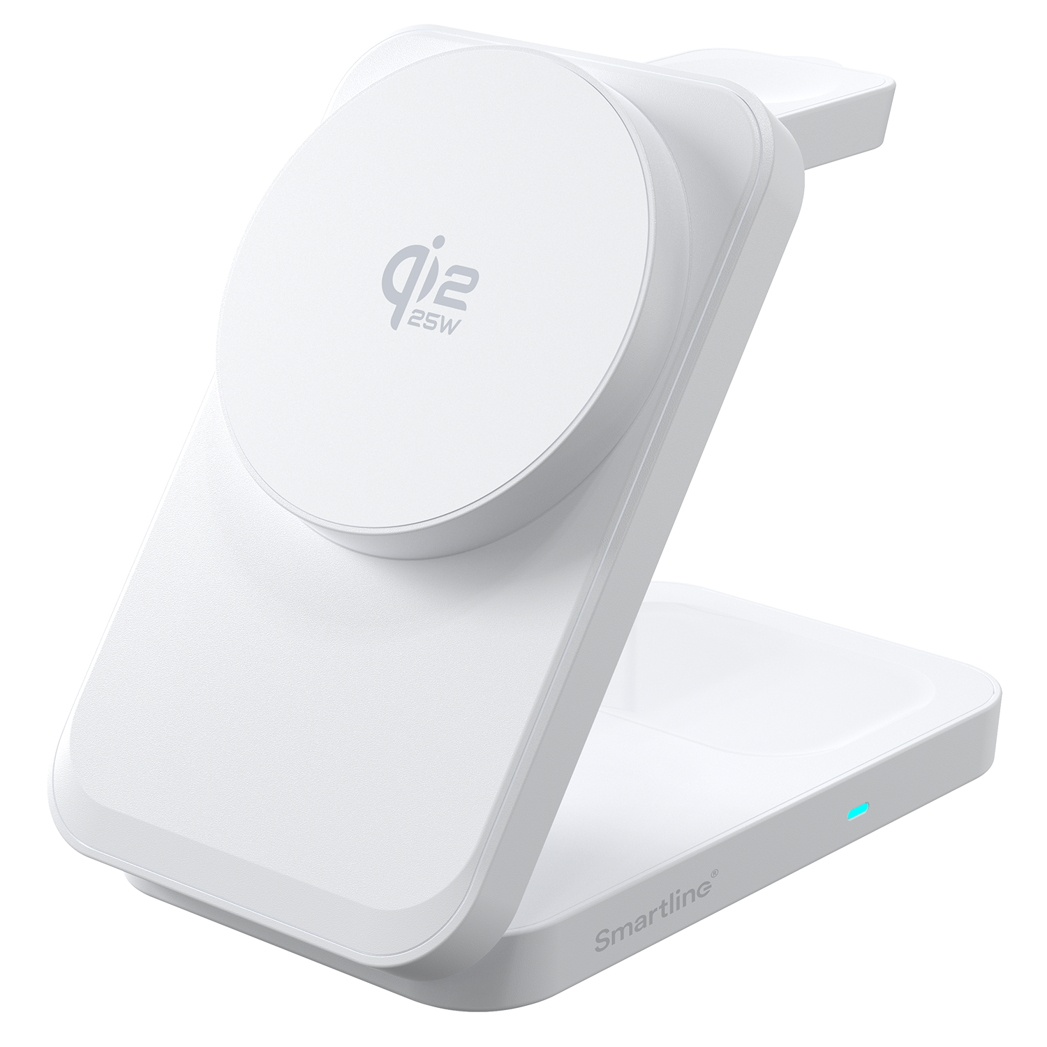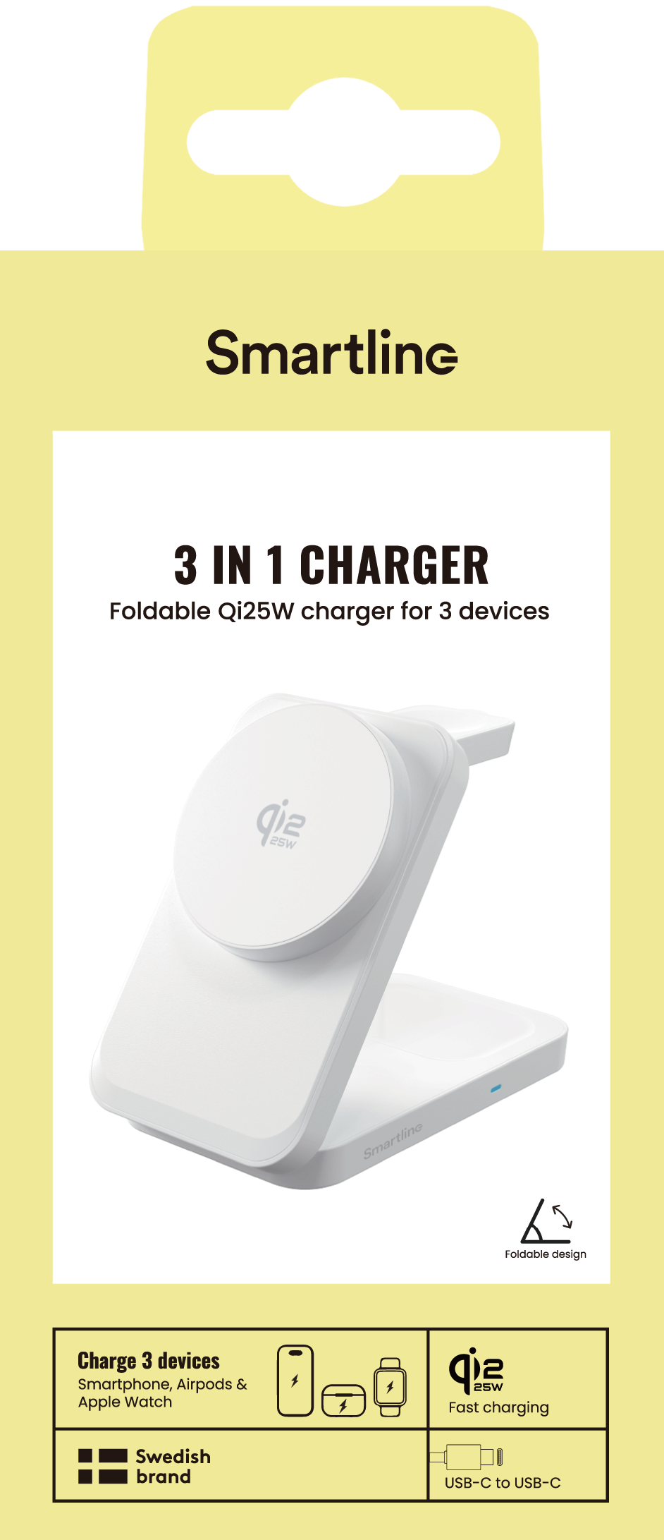Lataa jopa kolme laitetta samanaikaisesti tällä taitettavalla Qi2.2 25W MagSafe-laturilla. Lataa helposti puhelin, kello ja kuulokkeet samassa paikassa – täysin ilman sotkeutuvia johtoja. Kompakti ja taitettava muotoilu tekee siitä erinomaisen sekä työpöydälle että matkalle.