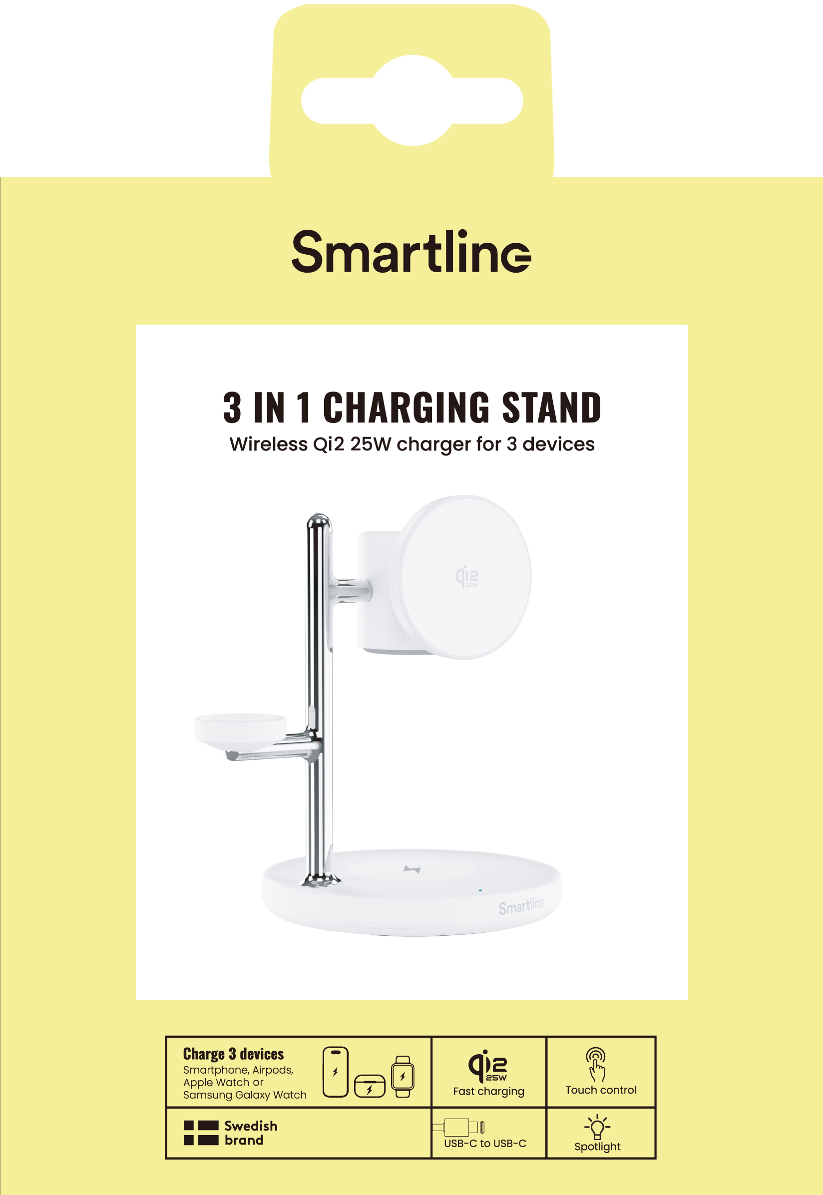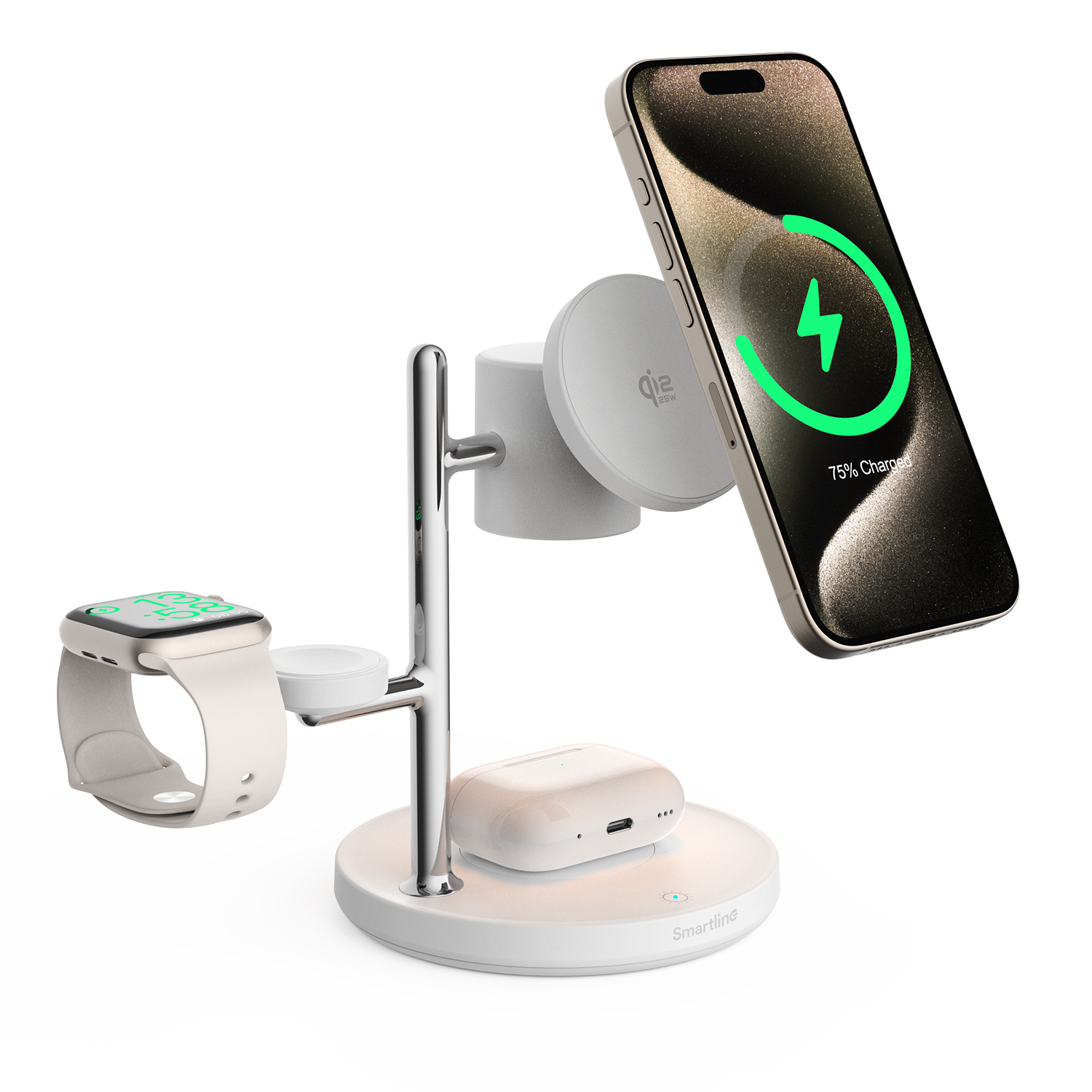 Lataa jopa kolme laitetta samanaikaisesti tällä Qi2.2 25W MagSafe lataustelineellä. Lataa helposti matkapuhelin, Apple Watch ja AirPods samassa paikassa ilman turhaa kaapelisotkua. Integroitu valaisin antaa pehmeän ja käytännöllisen valon, mikä tekee latausasemasta täydellisen sijoittaa työpöydälle tai yöpöydälle helppoa ja sujuvaa päivittäistä käyttöä varten.