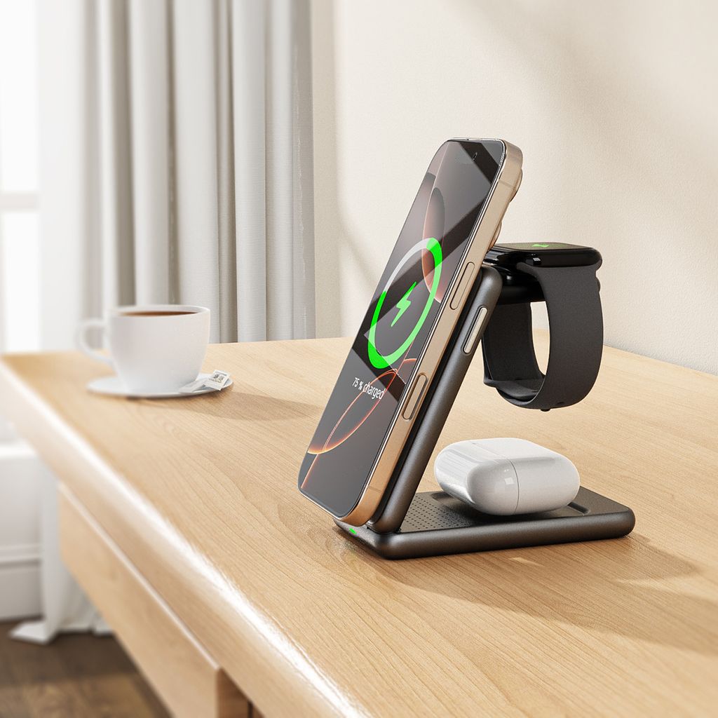 NEXTBATTin 3-in-1 taitettava langaton magneettinen latausasema 15W on käytännöllinen ja kompakti ratkaisu älypuhelimen, Apple Watchin ja langattomien kuulokkeiden samanaikaiseen lataamiseen. Taitettava rakenne tekee latausasemasta helpon kuljettaa mukana matkoilla tai käyttää kotona ja toimistossa, samalla säästäen tilaa työpöydällä.