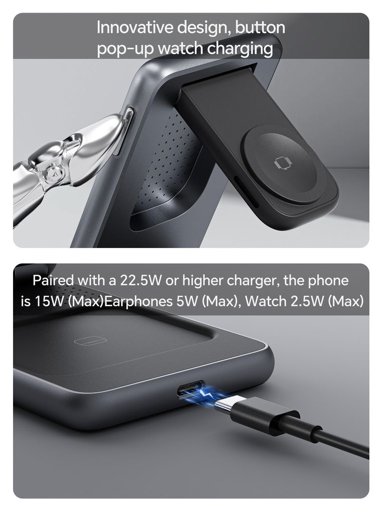 Magneettinen latauspinta varmistaa vakaan sijoituksen ja mahdollistaa puhelimen käytön sekä pysty- että vaaka-asennossa latauksen aikana. Latausasema tukee langatonta pikalatausta jopa 15W älypuhelimille sekä erillisiä latausalueita älykellolle ja kuulo... Lue lisää