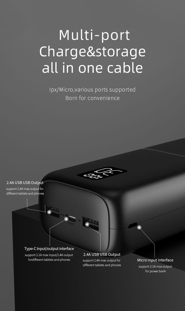 <p>Varavirtalähde on varustettu yhdellä USB-C-portilla ja kahdella USB-A-portilla, mikä antaa sinulle joustavuutta useiden laitteiden lataamiseen samanaikaisesti. USB-A-portit tukevat jopa 2.4A nopeaa ja tehokasta latausta varten. Varavirtalähde voidaan ladata myös USB-C:n tai Micro-USB:n kautta, mikä tekee käytöstä helppoa ja vaivatonta riippumatta käytettävissä olevasta kaapelista.</p>