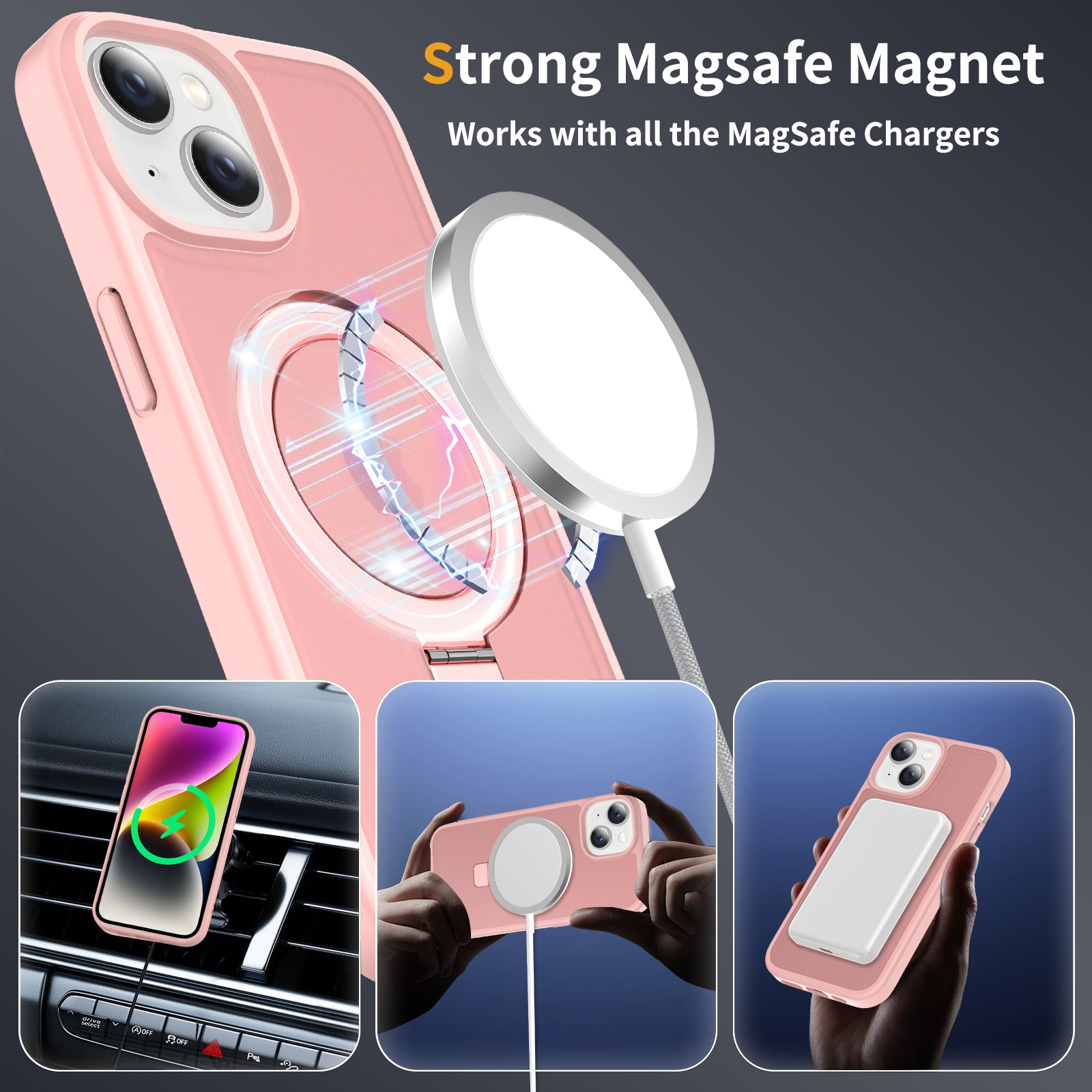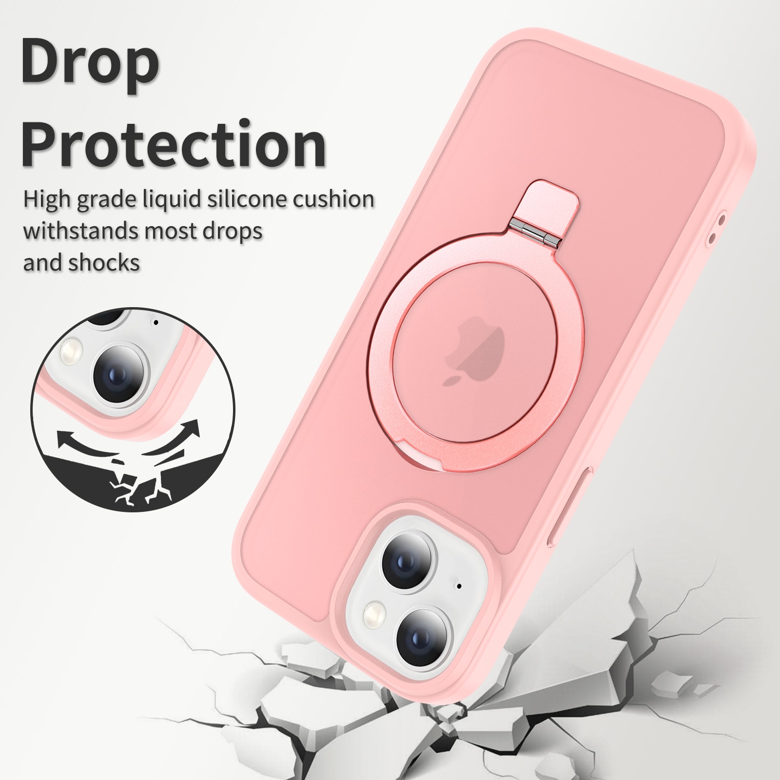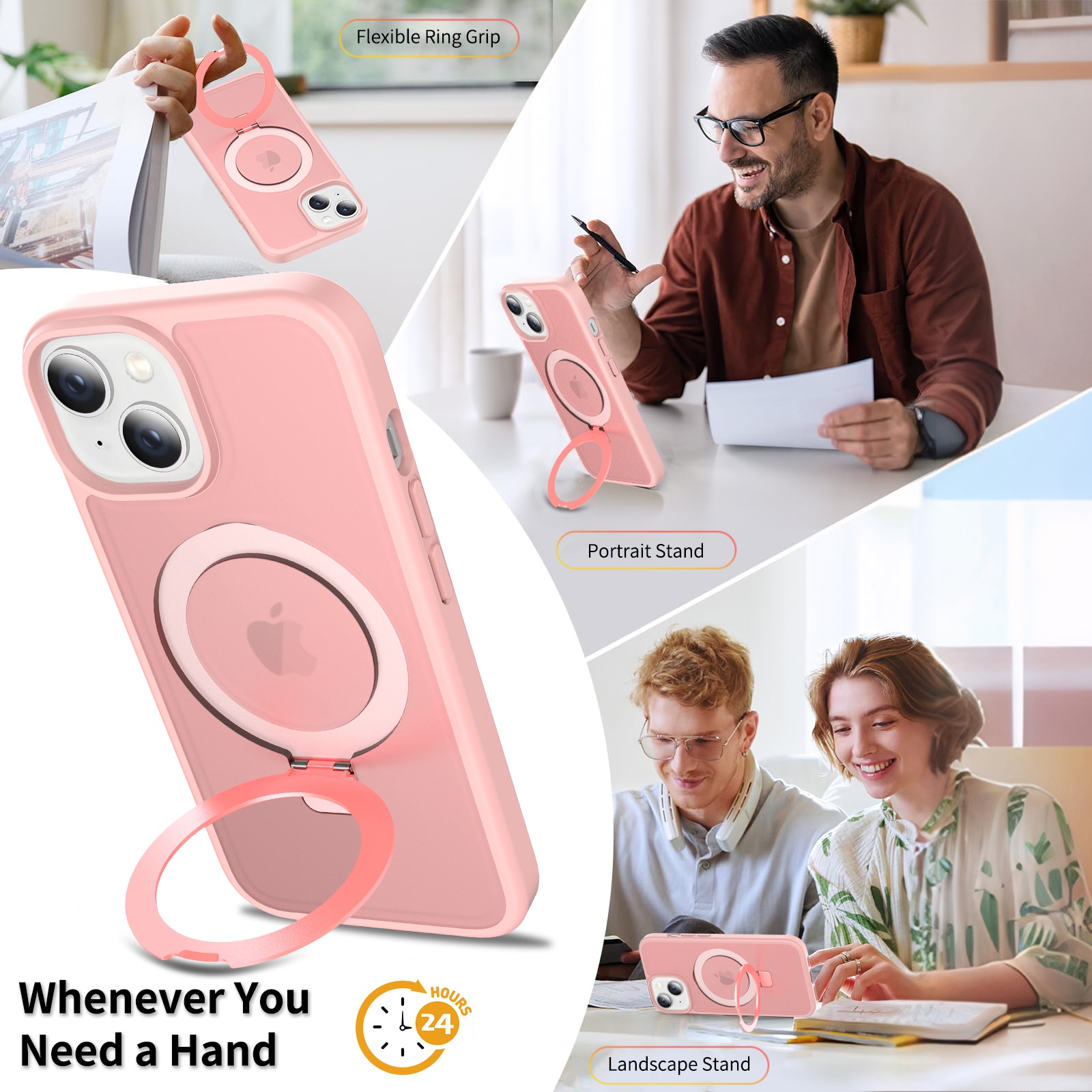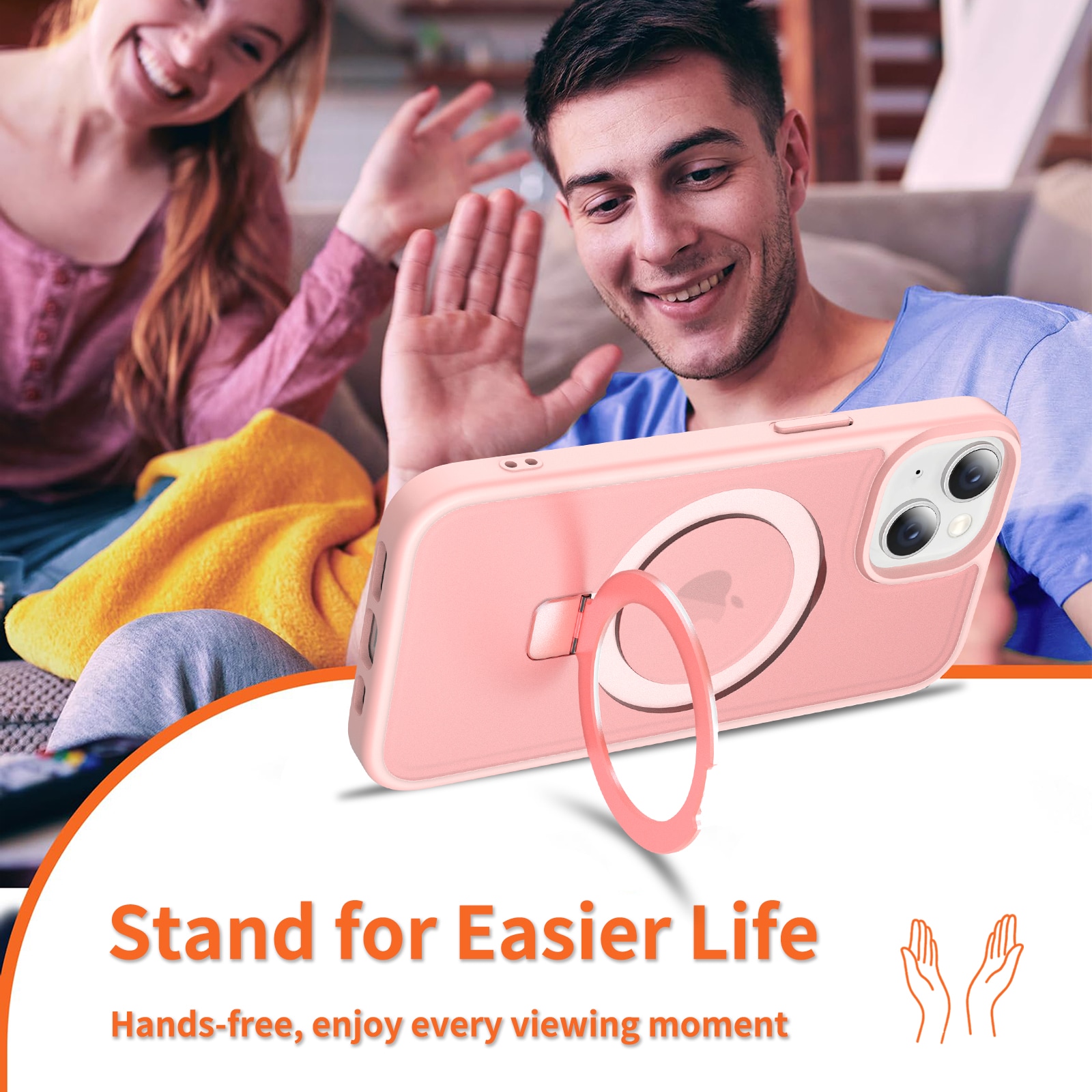 Suojakuori, jossa on taitettava magneettirengas Apple iPhone 13 -puhelimelle. Parhaan suojan takaamiseksi kuori on kaksiosainen- pehmeä TPU-sisus yhdistyy kovamuoviseen ulkokuoreen. Takaosan rengas on magneettinen ja yhteensopiva MagSafe-yhteensopivien lisävarusteiden, kuten laturien ja korttipidikkeiden kanssa. Rengasta voi käyttää myös jalustana elokuvien, videoiden tai pelien katseluun.