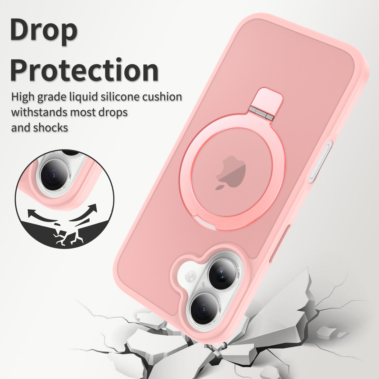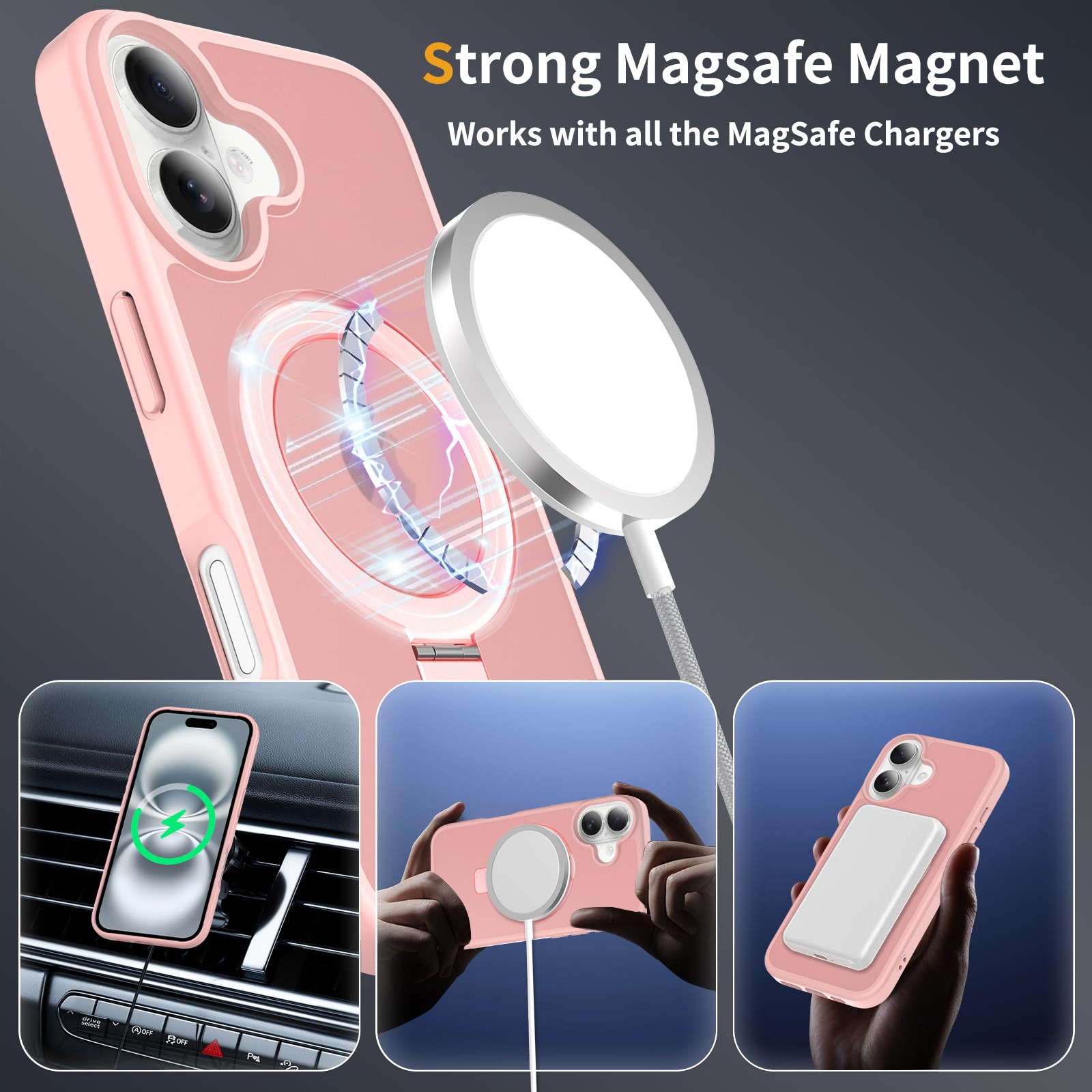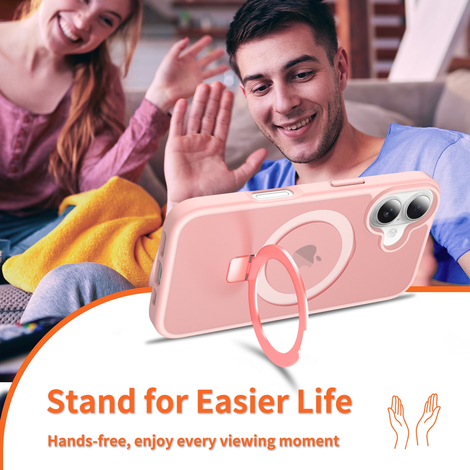 Suojakuori, jossa on taitettava magneettirengas Apple iPhone 16 -puhelimelle. Parhaan suojan takaamiseksi kuori on kaksiosainen- pehmeä TPU-sisus yhdistyy kovamuoviseen ulkokuoreen. Takaosan rengas on magneettinen ja yhteensopiva MagSafe-yhteensopivien lisävarusteiden, kuten laturien ja korttipidikkeiden kanssa. Rengasta voi käyttää myös jalustana elokuvien, videoiden tai pelien katseluun.
