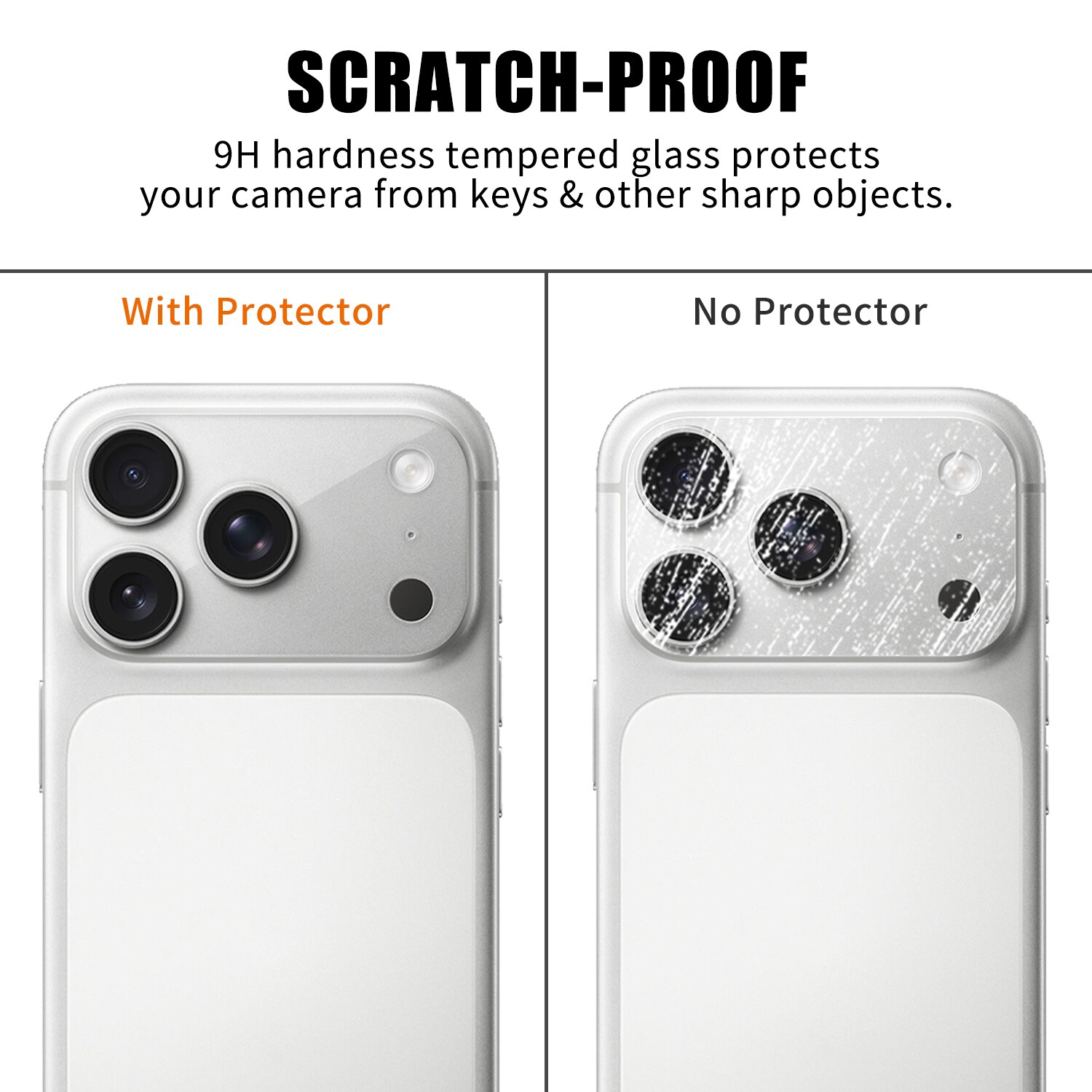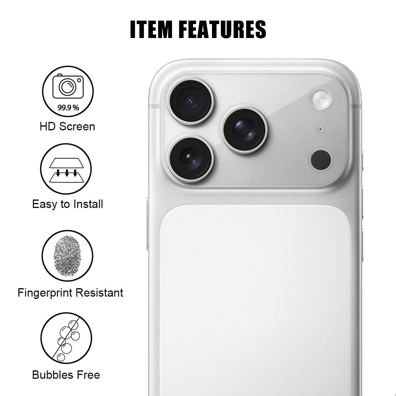 Kameralinssinsuojus karkaistusta lasista mallille Apple iPhone 17 Pro Max, suunniteltu suojaamaan kameramoduulia naarmuilta, iskuilta ja ulkoiselta kulumiselta. Suojus on täysin peittävä ja kattaa sekä linssit että kamerakotelon. Asennettuna suojus on huomaamaton eikä vaikuta puhelimen ulkonäköön.