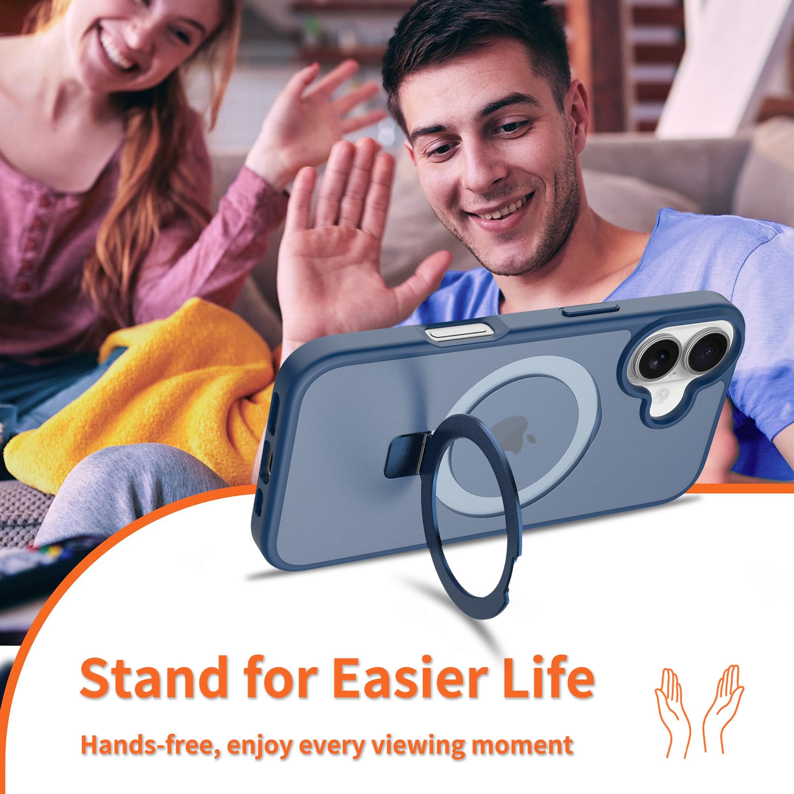 Suojakuori, jossa on taitettava magneettirengas Apple iPhone 17 -puhelimelle. Parhaan suojan takaamiseksi kuori on kaksiosainen- pehmeä TPU-sisus yhdistyy kovamuoviseen ulkokuoreen. Takaosan rengas on magneettinen ja yhteensopiva MagSafe-yhteensopivien lisävarusteiden, kuten laturien ja korttipidikkeiden kanssa. Rengasta voi käyttää myös jalustana elokuvien, videoiden tai pelien katseluun.