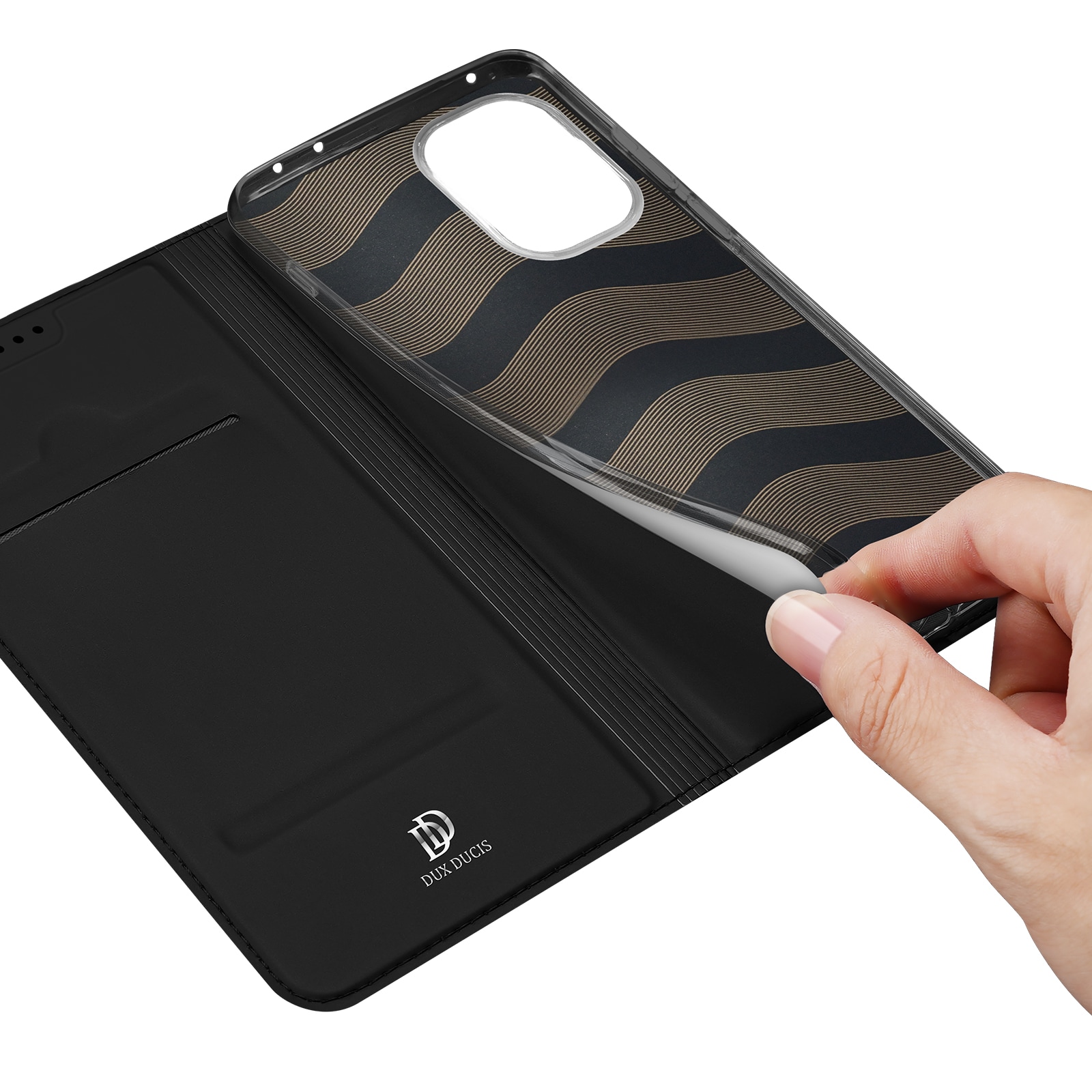 Ohut Dux Ducisin korttikotelo. Ohuesta ja kevyestä muotoilusta huolimatta tämä kotelo suojaa koko puhelinta. Puhelin on kiinnitetty tukevasti iskuja vaimentavaan TPU-koteloon.