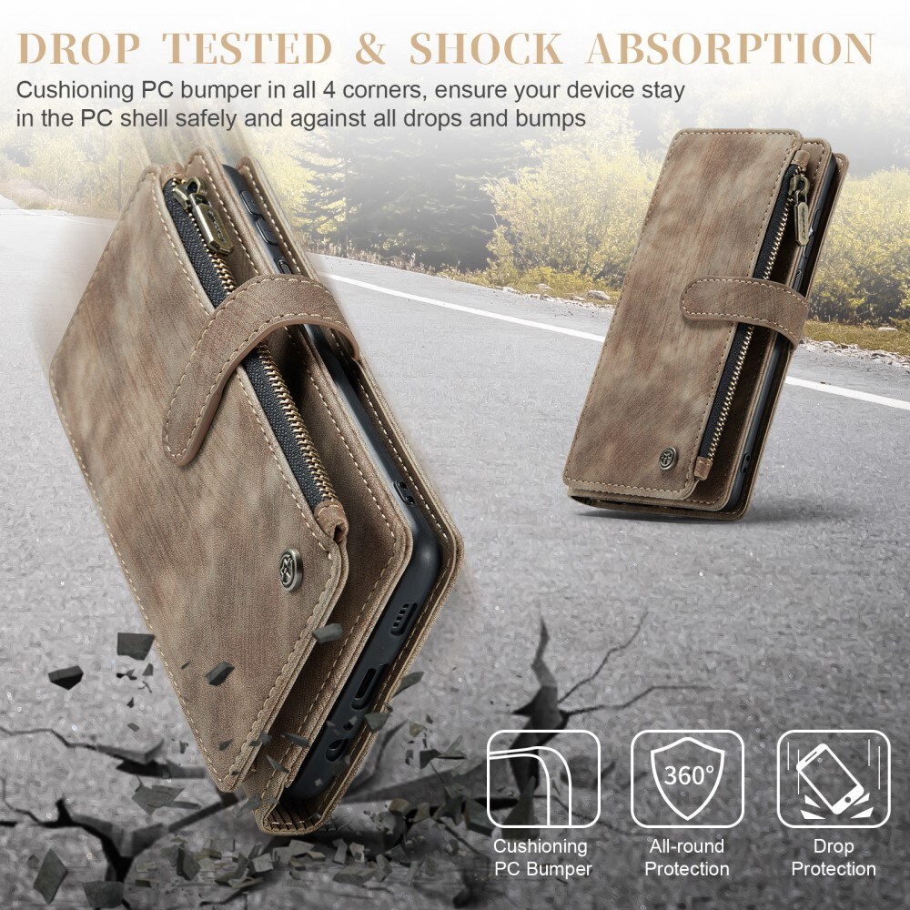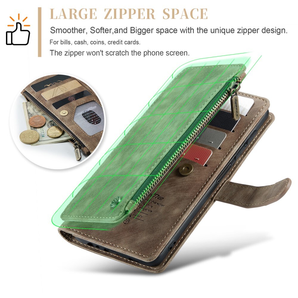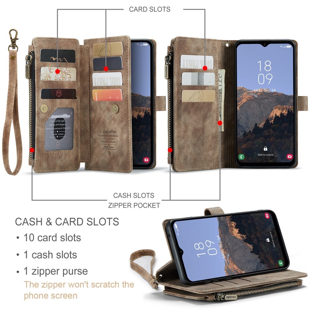 Tilava lompakkokotelo useilla korttipaikoilla Samsung Galaxy A14 -puhelimelle Casemelta. Lompakossa on seitsemän korttipaikkaa, setelitasku sekä tilava vetoketjullinen kolikkotasku.