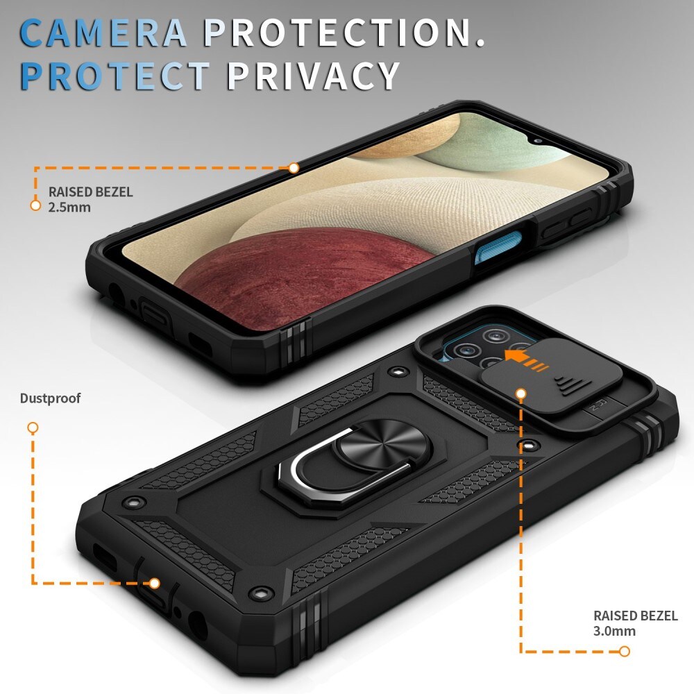Puhelinkuori ulosvedettävällä sormuspidikkeellä Samsung Galaxy A42 5G -laitteelle. Parhaan mahdollisen suojan takaamiseksi iskuilta ja pudotuksilta kuori on kolmiosainen: siinä on iskuja vaimentava TPU-ydin, kova ulkokuori ja suojaava kehys näytön ympärillä. Takana oleva kameran suojaläppä pitää linssit turvassa, kun et käytä kameraa. Sormus voidaan vetää esiin parantamaan otetta tai sitä voi käyttää telineenä videoiden, klippien tai pelien katseluun.