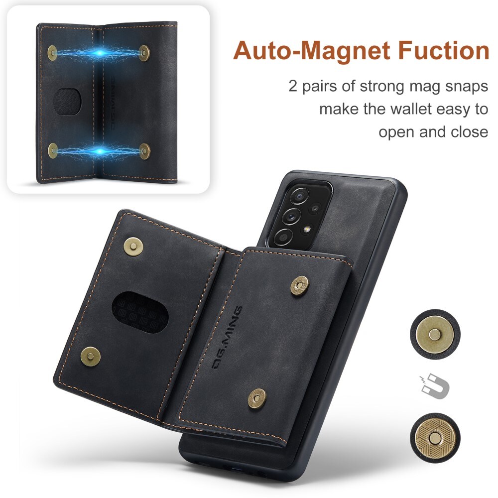 Keinonahkakuori Samsung Galaxy A52 5G -puhelimelle, mukana tulevalla lompakolla. Lompakko kiinnittyy magneeteilla kuoren taakse ja on helppo irrottaa, kun sitä ei tarvita. Lompakon voi taittaa auki jalustaksi, jolloin voit kätevästi katsoa elokuvia tai videoleikkeitä.