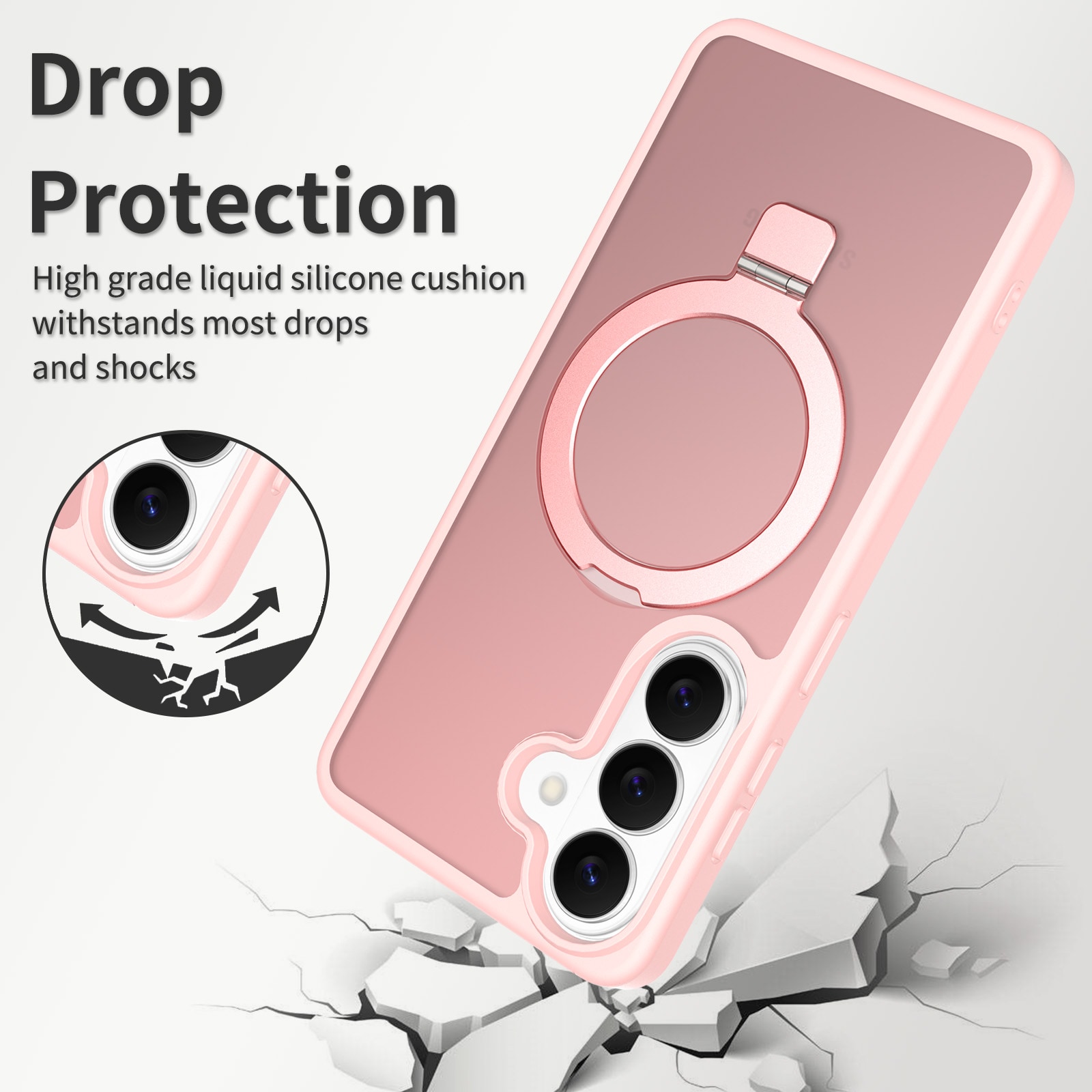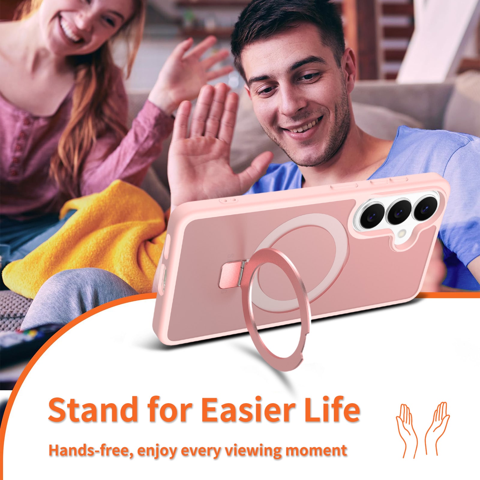 Suojakuori, jossa on taitettava magneettirengas Samsung Galaxy A57 -puhelimelle. Parhaan suojan takaamiseksi kuori on kaksiosainen- pehmeä TPU-sisus yhdistyy kovamuoviseen ulkokuoreen. Takaosan rengas on magneettinen ja yhteensopiva MagSafe-yhteensopivien lisävarusteiden, kuten laturien ja korttipidikkeiden kanssa. Rengasta voi käyttää myös jalustana elokuvien, videoiden tai pelien katseluun.