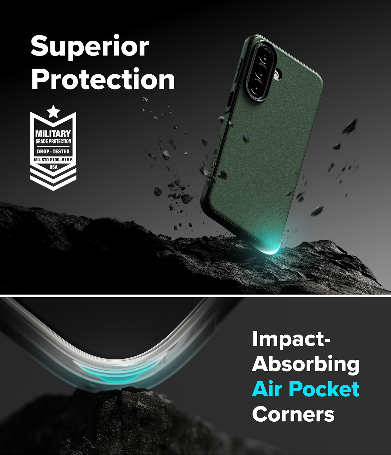 Kuori on tarkasti muotoiltu, jotta kaikki toiminnot, painikkeet ja liitännät toimivat normaalisti. Kulmissa on lisävahvistus parhaan mahdollisen suojan takaamiseksi pudotuksia ja iskuja vastaan. Kuori on testattu ja täyttää Yhdysvaltain armeijan MIL-STD 810G-516.6 -standardin vaatimukset iskusuojaukselle.