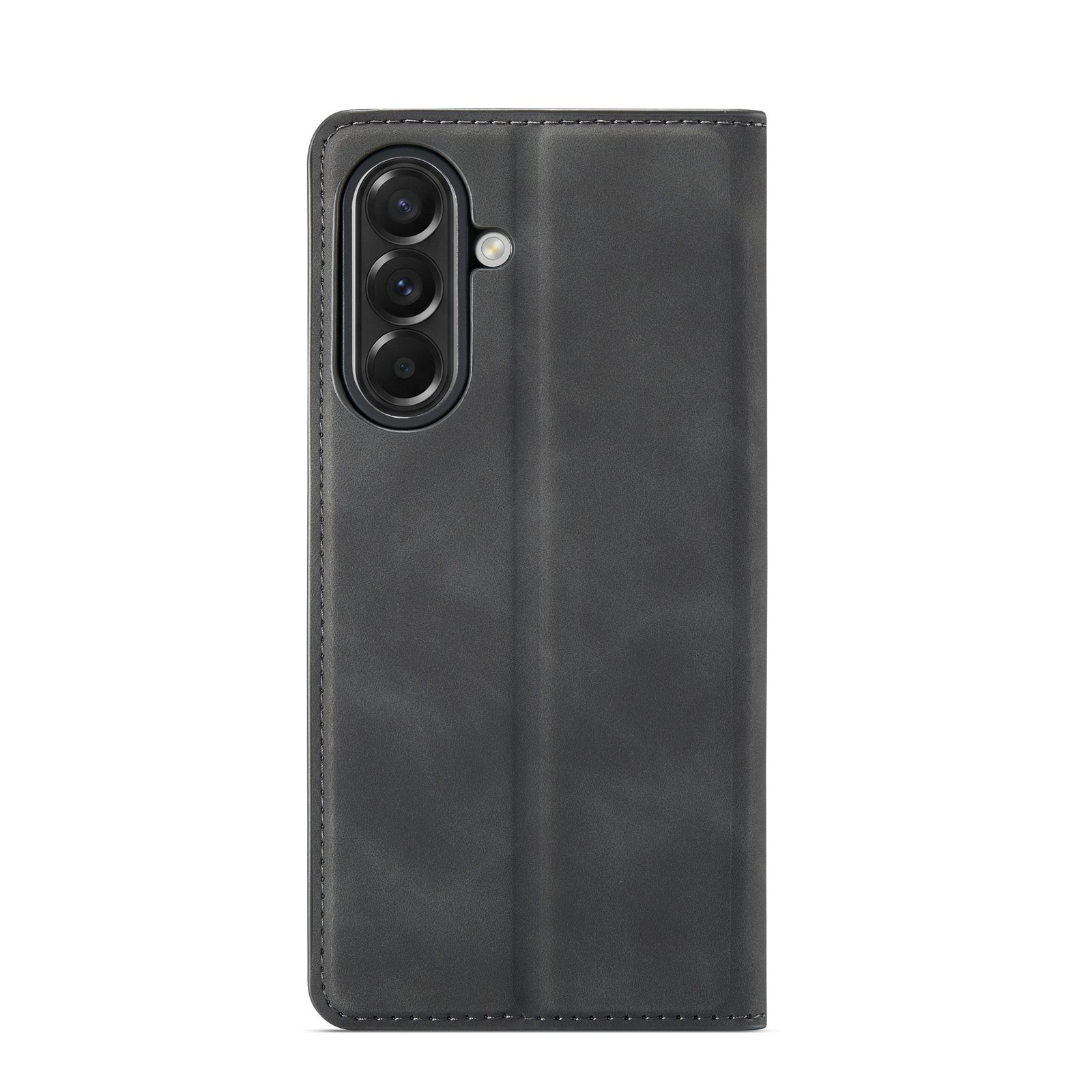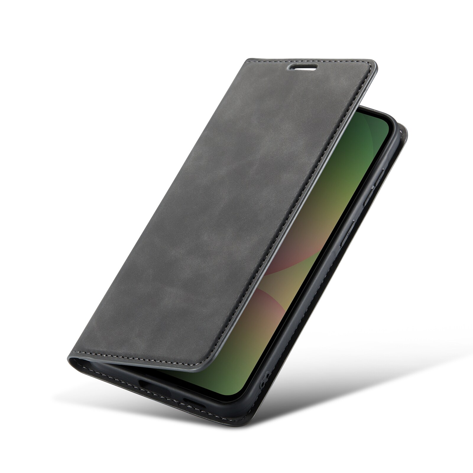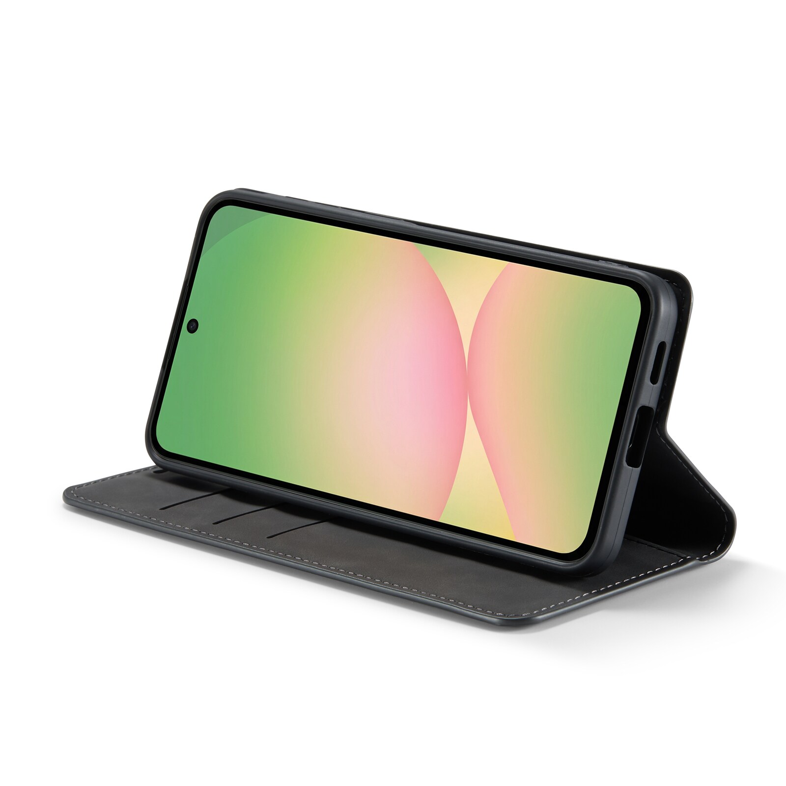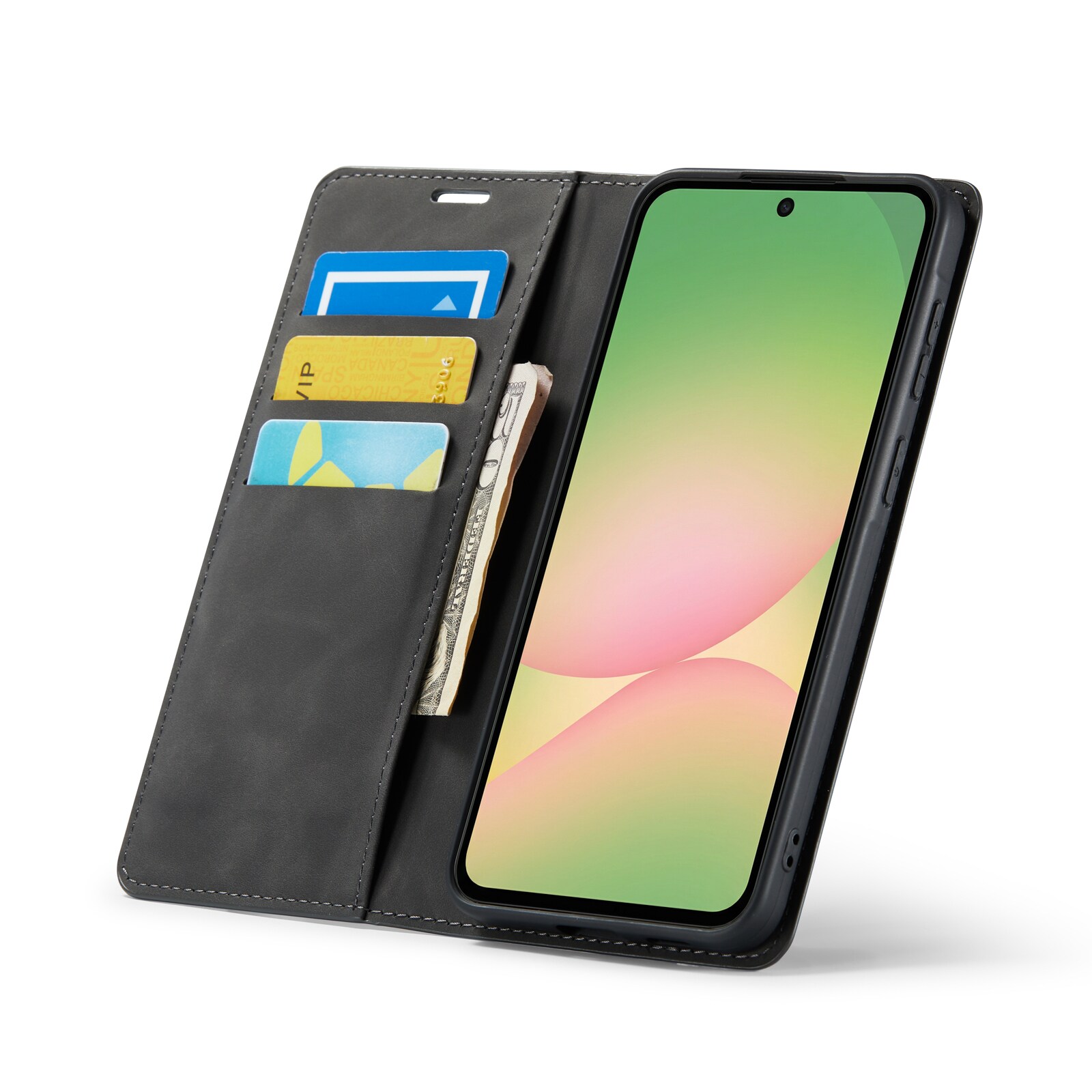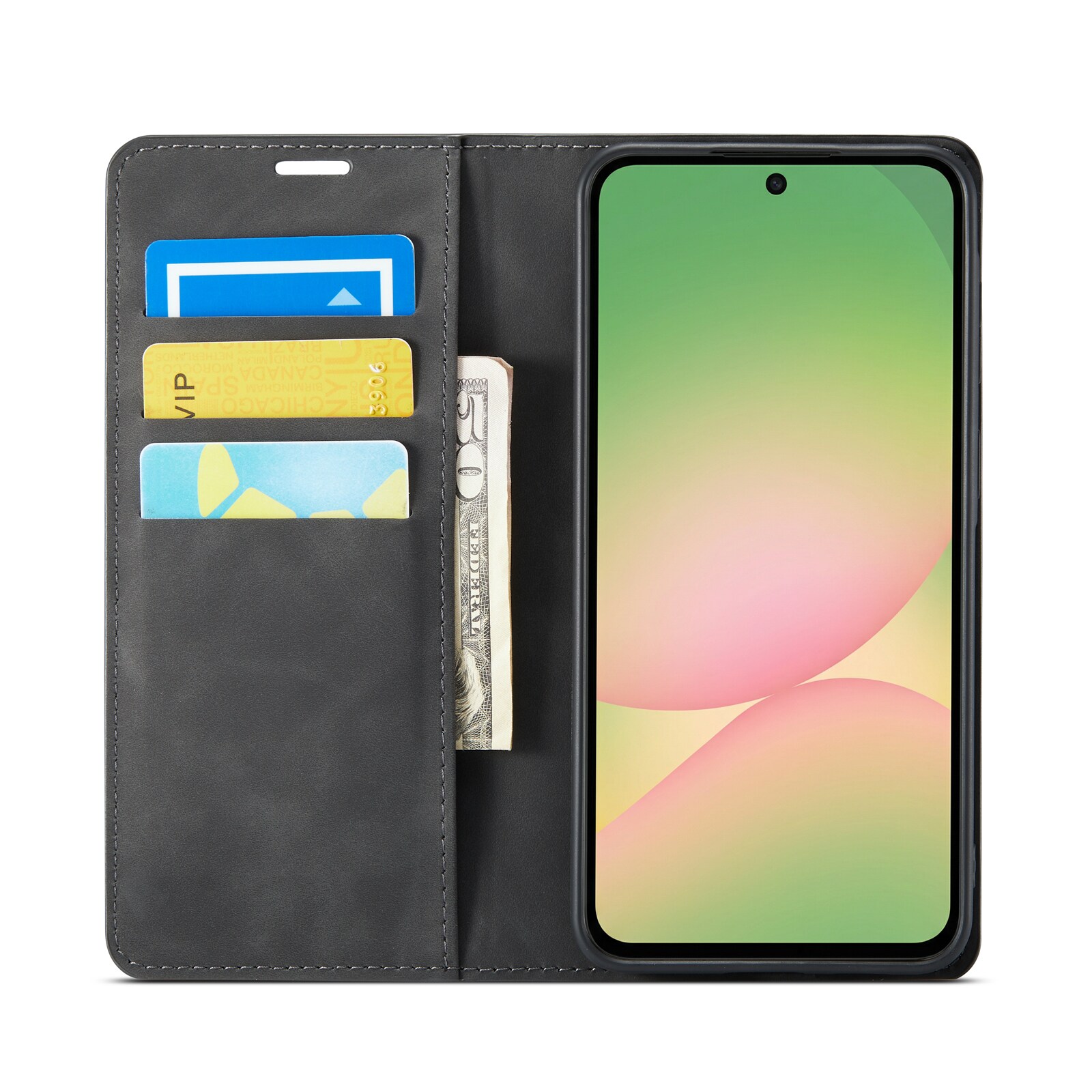 Tyylikäs ja ohut puhelinlompakko mallille Samsung Galaxy A57. Kuoressa on silkinpehmeä kansi, joka on valmistettu kestävästä keinonahasta, sekä sisäinen iskuja vaimentava TPU-sisäkuori. Kansi suojaa tehokkaasti näyttöä naarmuilta, ja sisäkuori antaa hyvän suojan kolhuilta ja pudotuksilta.