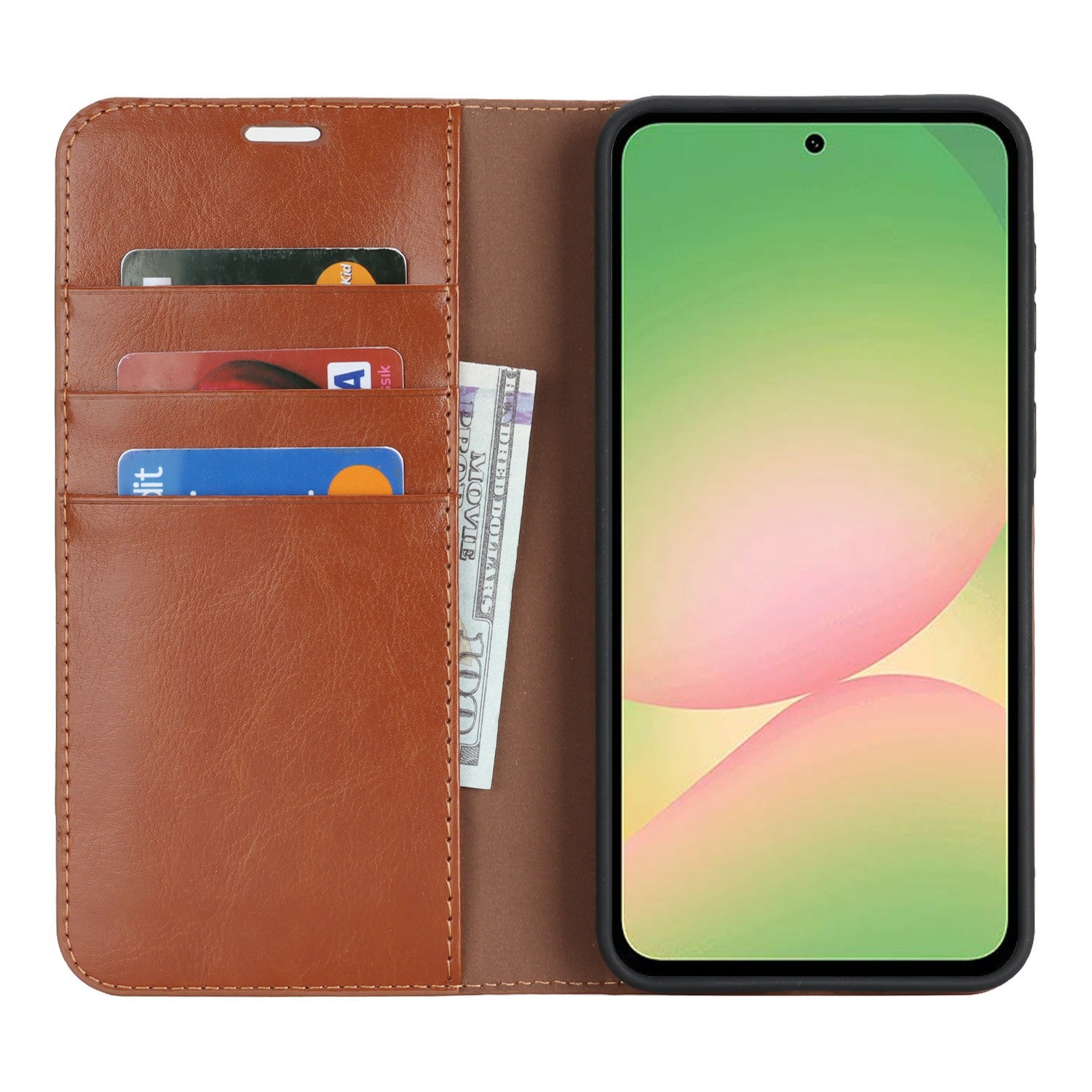 Kätevä ja tyylikäs kännykkäkotelo aitoa nahkaa. Kotelo suojaa koko puhelimesi ja kannen sisäpuolella on lompakko. Lompakko on tilava, jossa on kolme korttitaskua ja setelitasku.