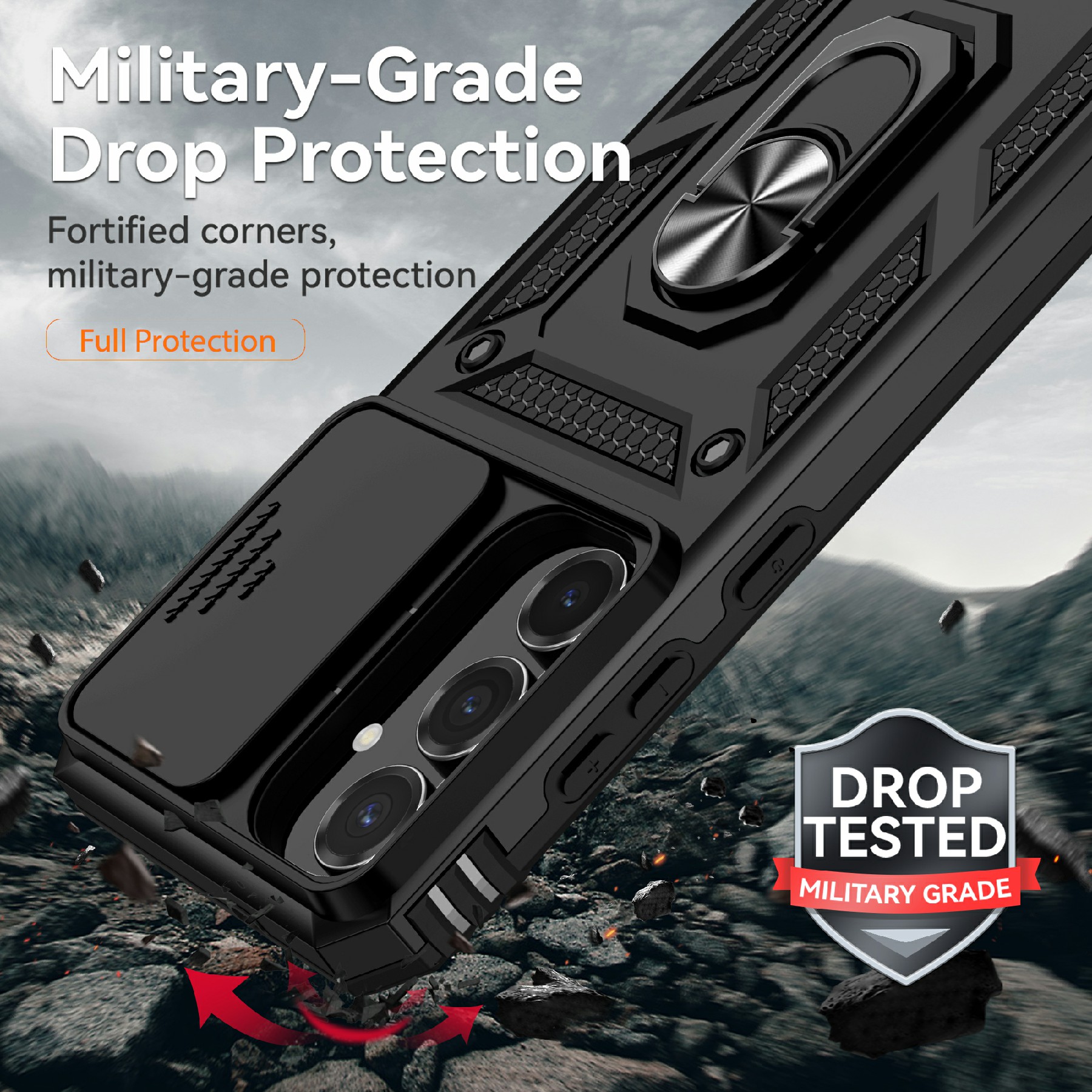 Puhelinkuori ulosvedettävällä sormuspidikkeellä Samsung Galaxy S25 FE -laitteelle. Parhaan mahdollisen suojan takaamiseksi iskuilta ja pudotuksilta kuori on kolmiosainen: siinä on iskuja vaimentava TPU-ydin, kova ulkokuori ja suojaava kehys näytön ympärillä. Takana oleva kameran suojaläppä pitää linssit turvassa, kun et käytä kameraa. Sormus voidaan vetää esiin parantamaan otetta tai sitä voi käyttää telineenä videoiden, klippien tai pelien katseluun.