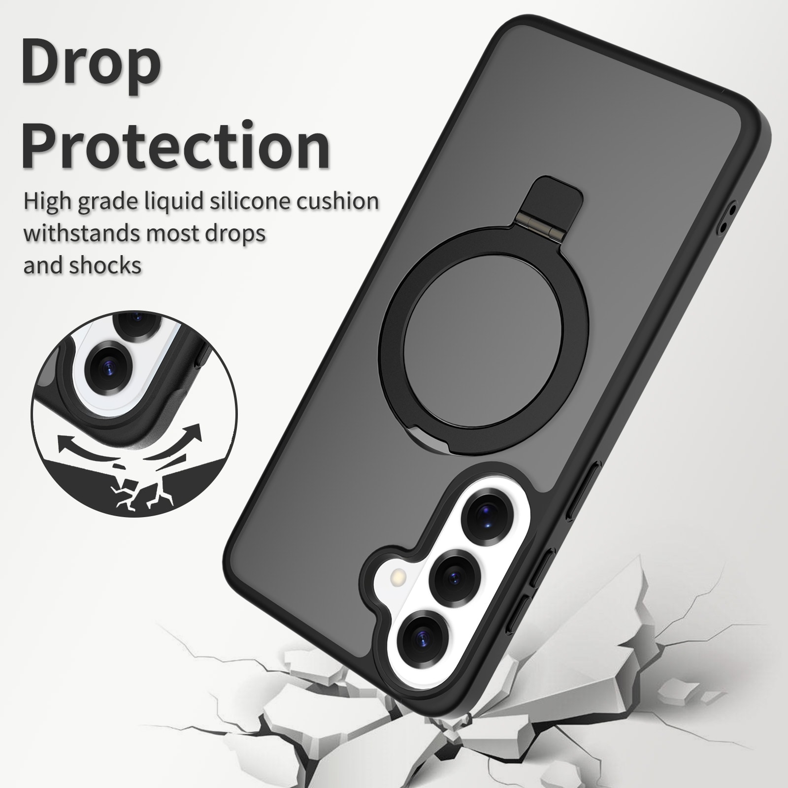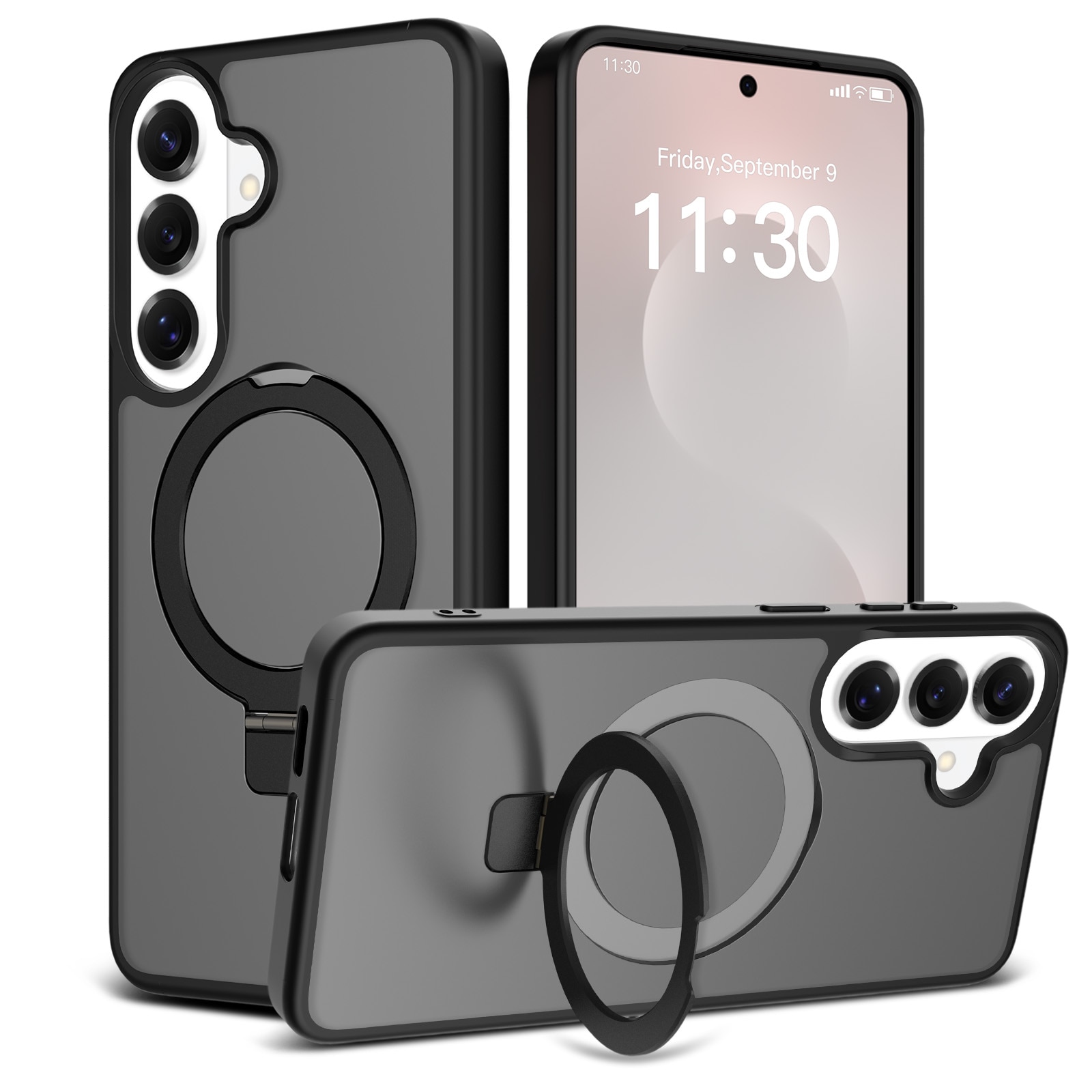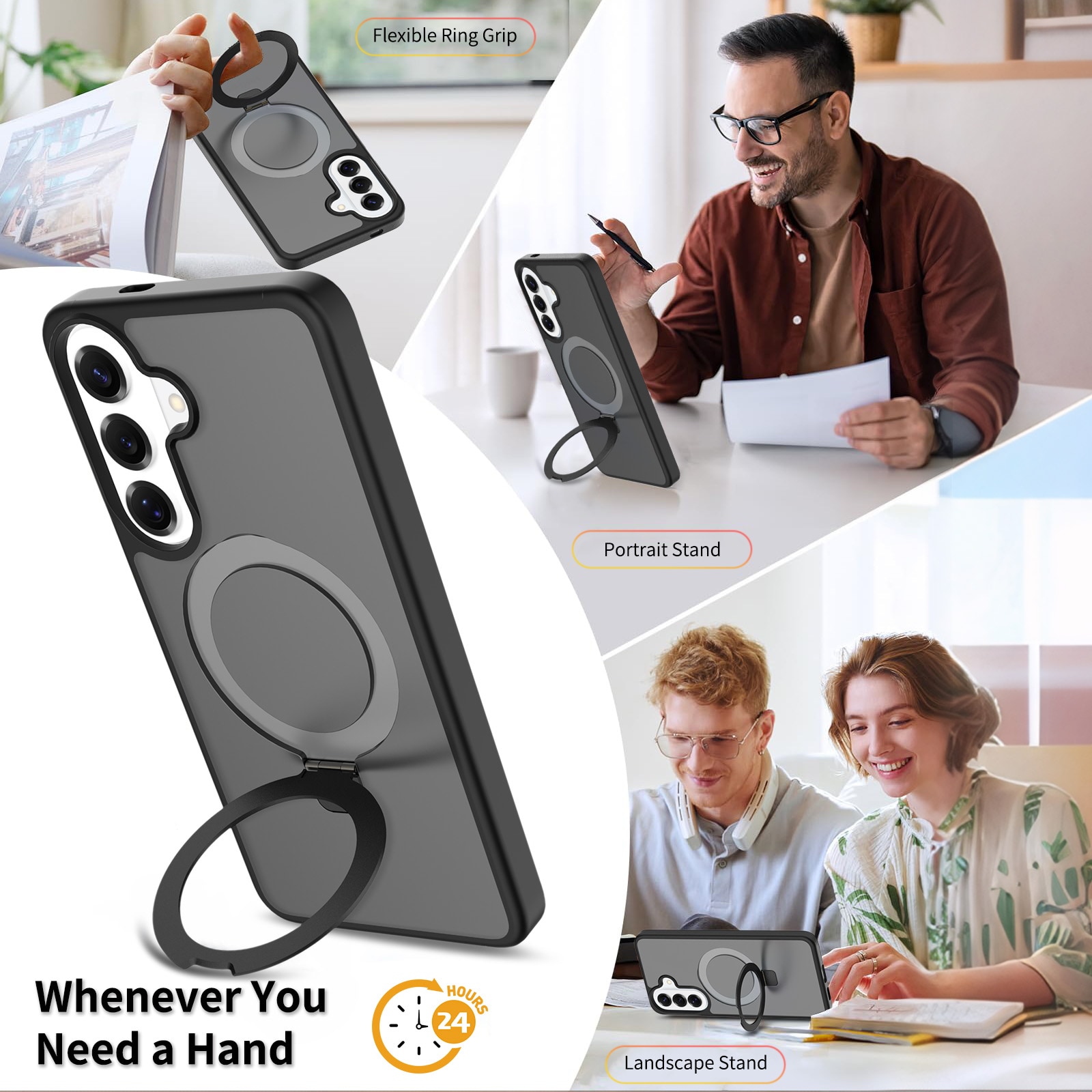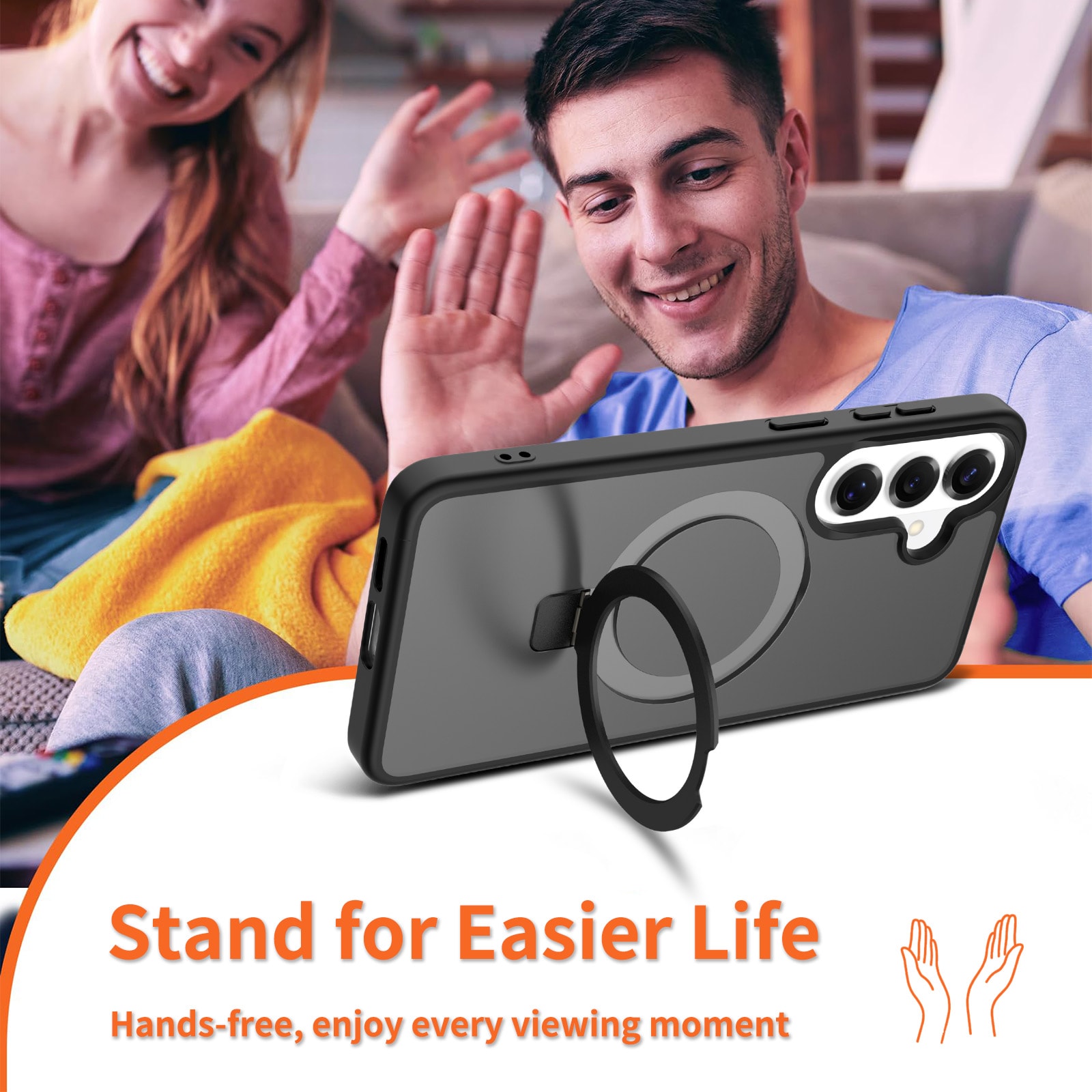 Suojakuori, jossa on taitettava magneettirengas Samsung Galaxy S26 Plus -puhelimelle. Parhaan suojan takaamiseksi kuori on kaksiosainen- pehmeä TPU-sisus yhdistyy kovamuoviseen ulkokuoreen. Takaosan rengas on magneettinen ja yhteensopiva MagSafe-yhteensopivien lisävarusteiden, kuten laturien ja korttipidikkeiden kanssa. Rengasta voi käyttää myös jalustana elokuvien, videoiden tai pelien katseluun.
