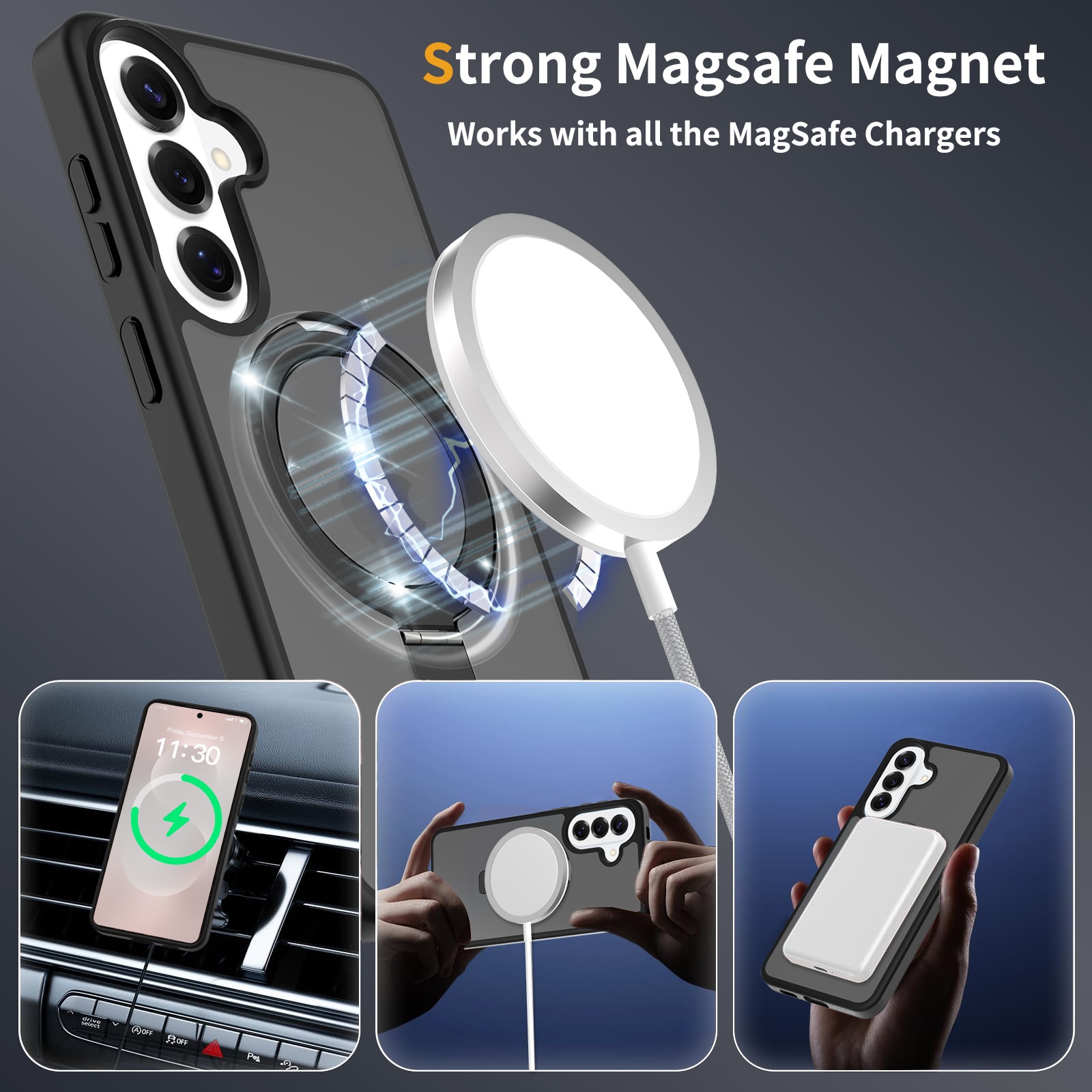 - Taitettava MagSafe-rengas toimii myös puhelintelineenä