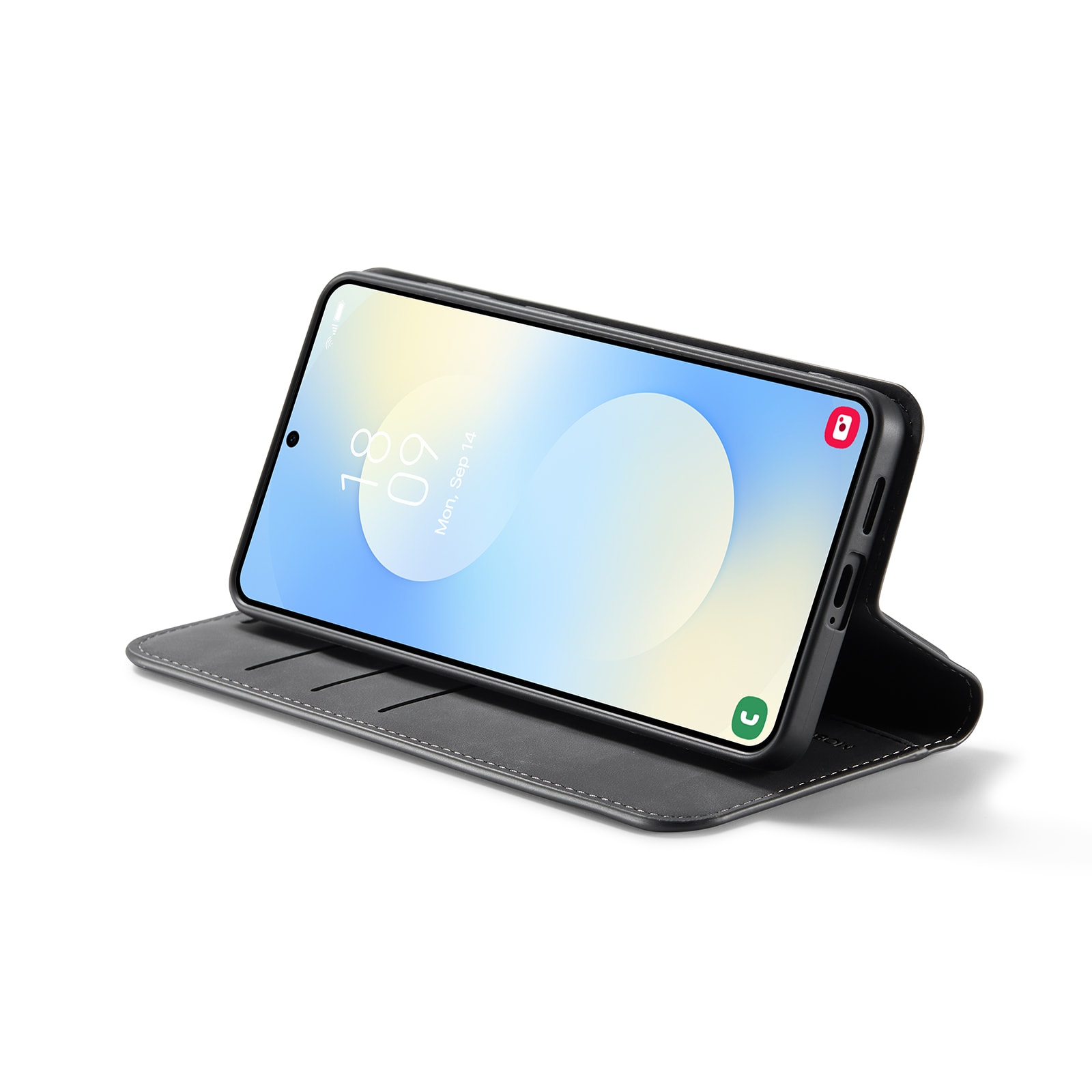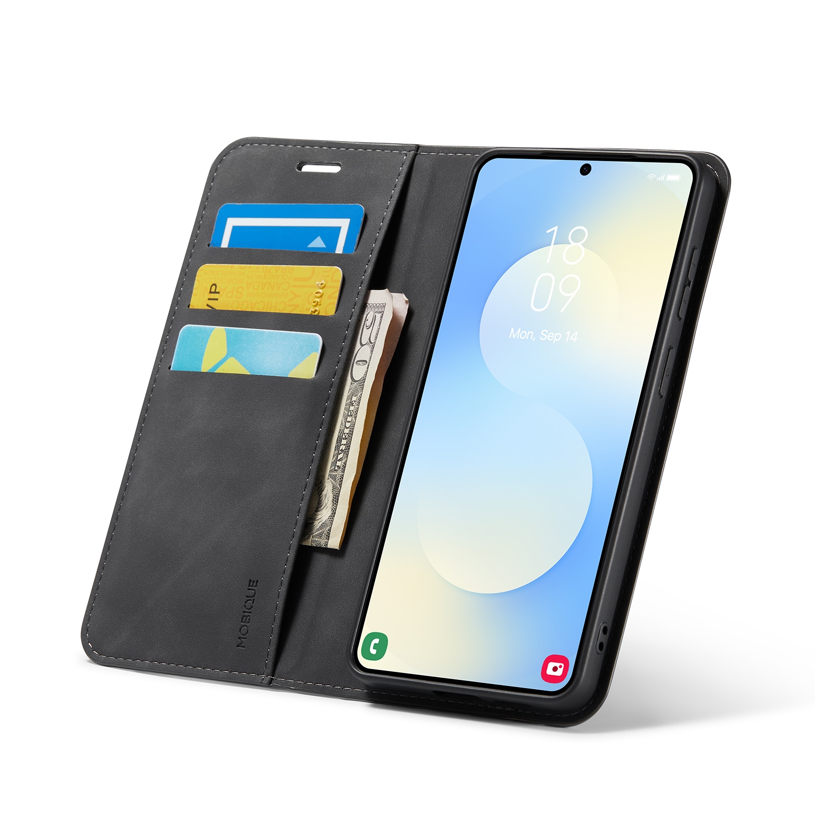Tyylikäs ja ohut puhelinlompakko mallille Samsung Galaxy S26 Plus. Kuoressa on silkinpehmeä kansi, joka on valmistettu kestävästä keinonahasta, sekä sisäinen iskuja vaimentava TPU-sisäkuori. Kansi suojaa tehokkaasti näyttöä naarmuilta, ja sisäkuori antaa hyvän suojan kolhuilta ja pudotuksilta.