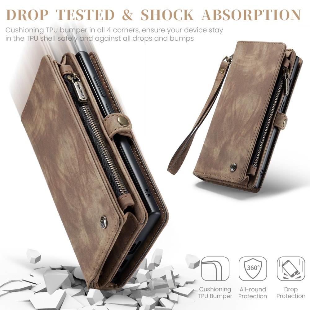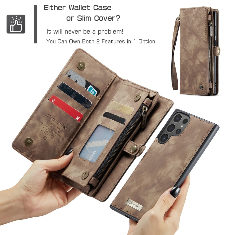 CaseMen kännykkäkotelo magneettikuorella ja lompakko, jossa on paljon korttipaikkoja. Lompakossa on setelitasku, vetoketjullinen kolikkotasku ja useita korttitaskuja.
