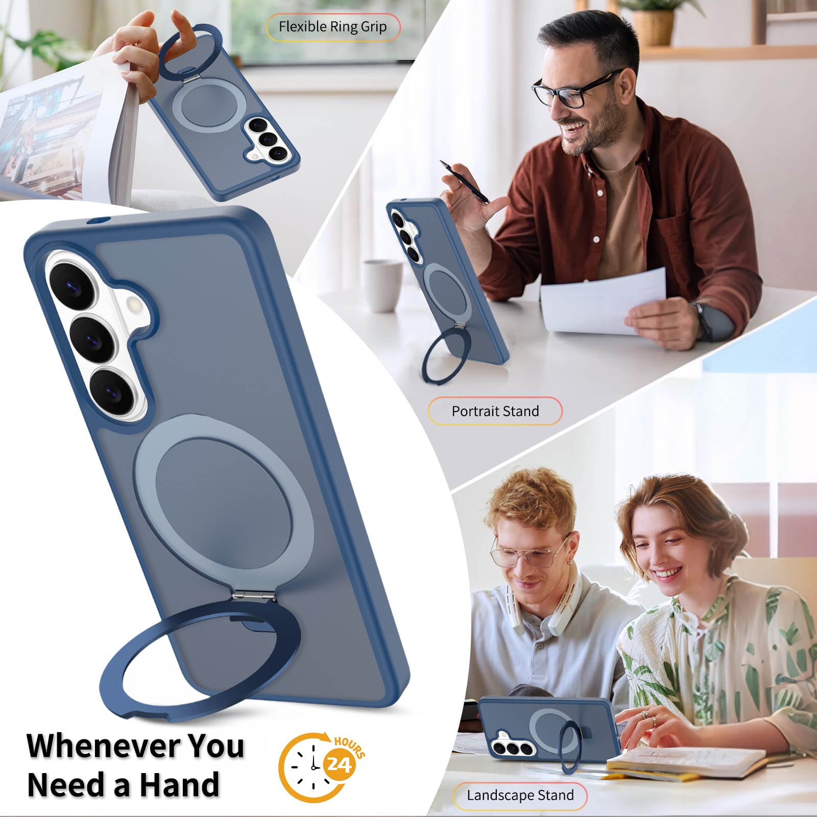 Suojakuori, jossa on taitettava magneettirengas Samsung Galaxy S26 Plus -puhelimelle. Parhaan suojan takaamiseksi kuori on kaksiosainen- pehmeä TPU-sisus yhdistyy kovamuoviseen ulkokuoreen. Takaosan rengas on magneettinen ja yhteensopiva MagSafe-yhteensopivien lisävarusteiden, kuten laturien ja korttipidikkeiden kanssa. Rengasta voi käyttää myös jalustana elokuvien, videoiden tai pelien katseluun.