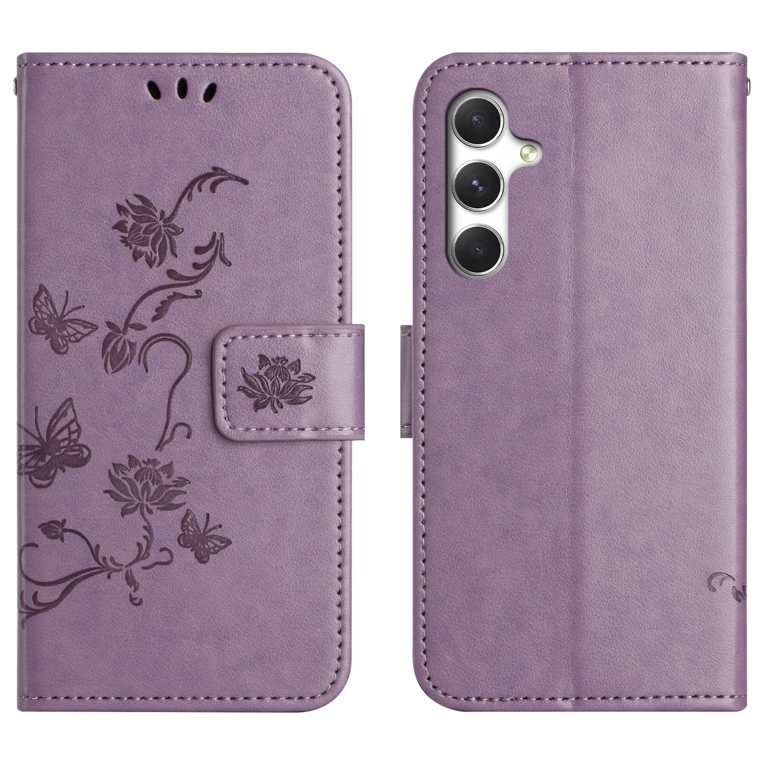 Kännykkäkotelo, jossa perhosia ja kuvio painettu nahkaan. Lompakkokotelo on hyvännäköinen ja suojaa koko puhelinta, jotta vältyt vahingoilta, naarmuilta ja lialta.