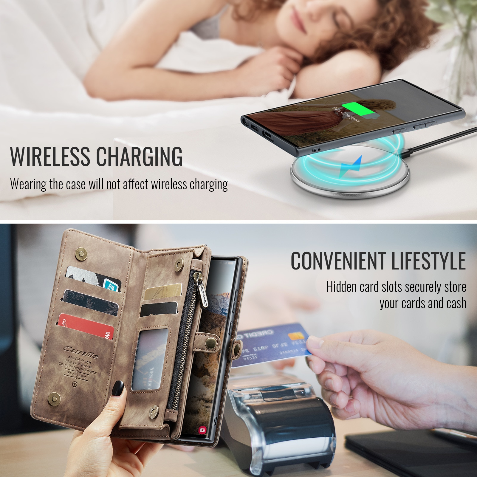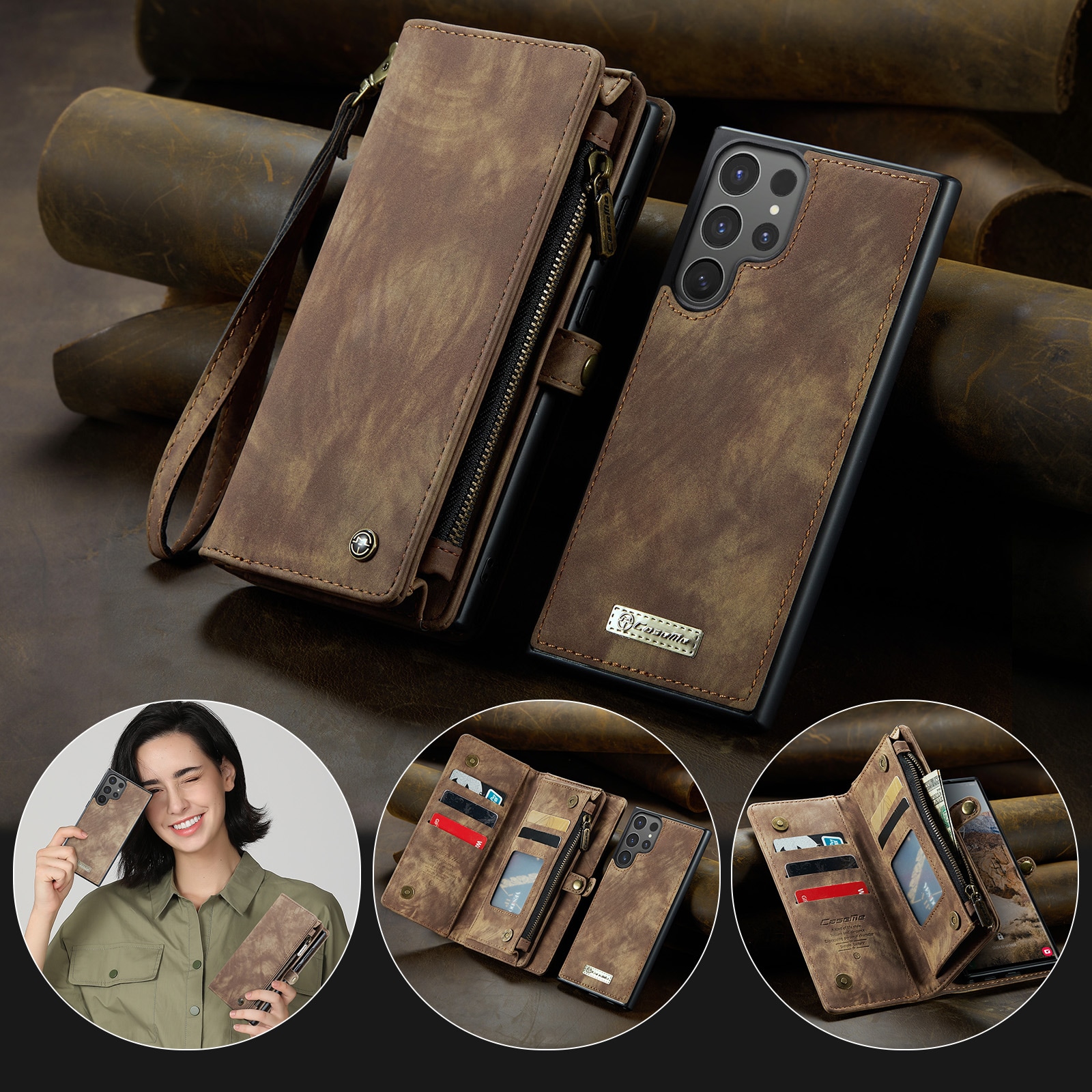 CaseMen kännykkäkotelo magneettikuorella ja lompakko, jossa on paljon korttipaikkoja. Lompakossa on setelitasku, vetoketjullinen kolikkotasku ja useita korttitaskuja.