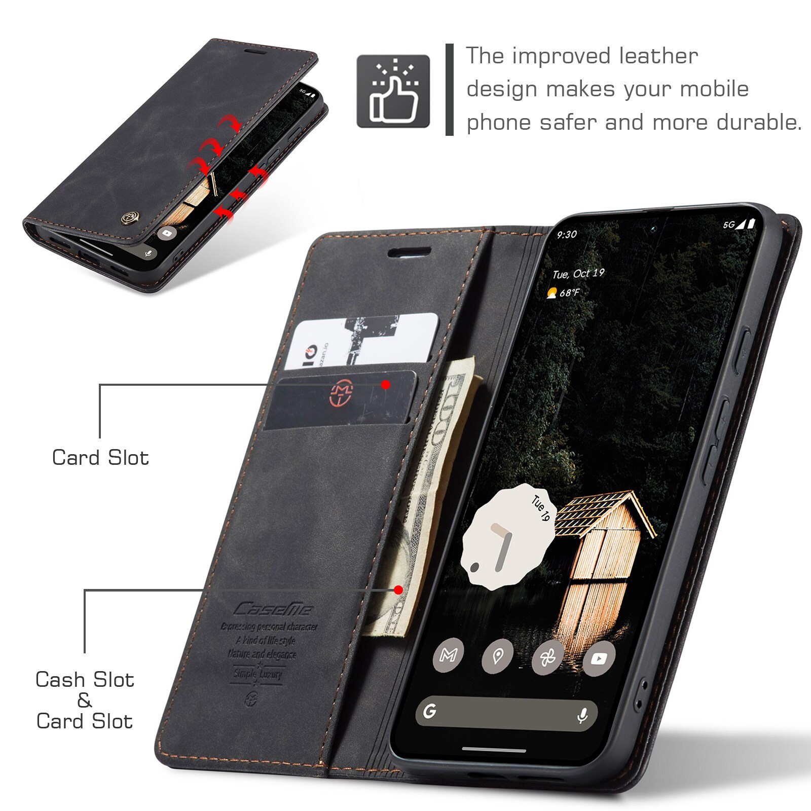 Ohut ja tyylikäs lompakkokotelo Casemelta Google Pixel 10a -puhelimelle. Kotelon avulla suojaat puhelimesi joka puolelta tinkimättä ulkonäöstä. Läppä pysyy kiinni näkymättömien magneettien avulla, mikä takaa ohuen muotoilun ilman ylimääräistä bulkkiutta.