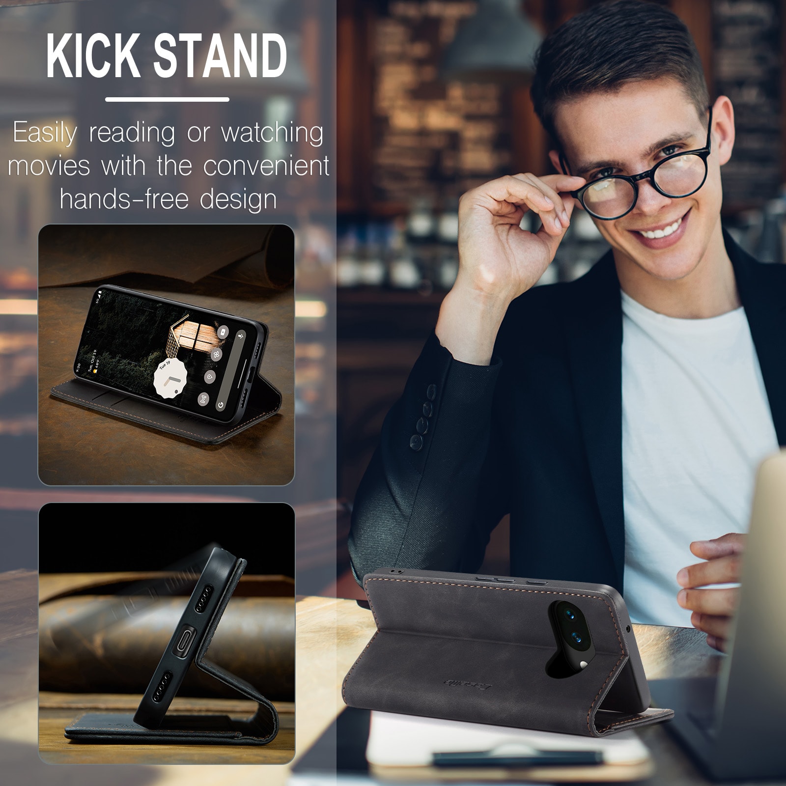 Läpän sisäpuolella oleva lompakko pitää korttisi tallessa, ja mukana on myös tasku seteleille tai kuiteille. Kun haluat katsoa sarjoja tai elokuvia, voit taittaa kotelon kätevästi puhelintelineeksi.