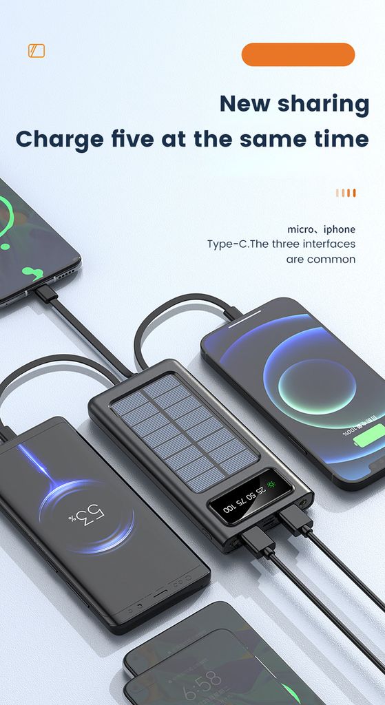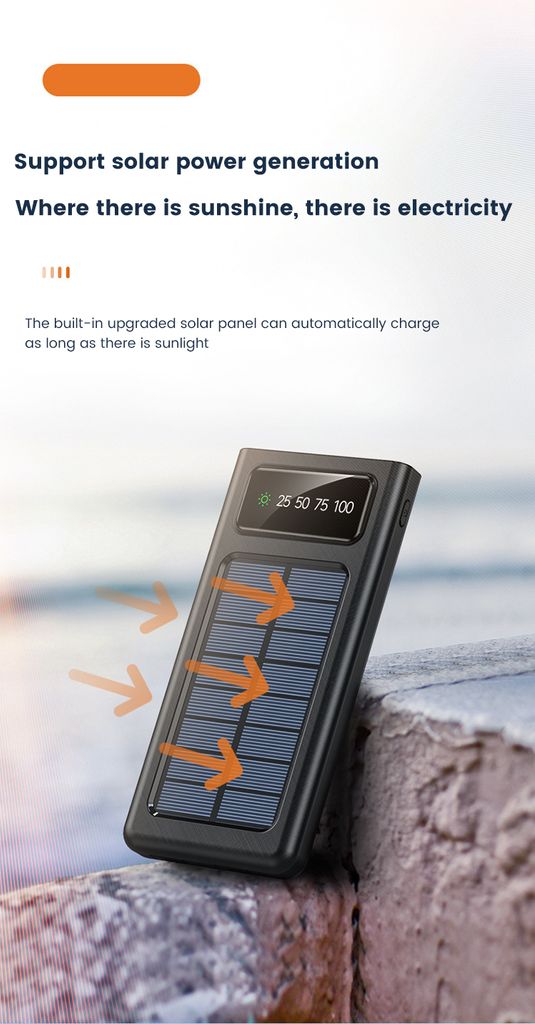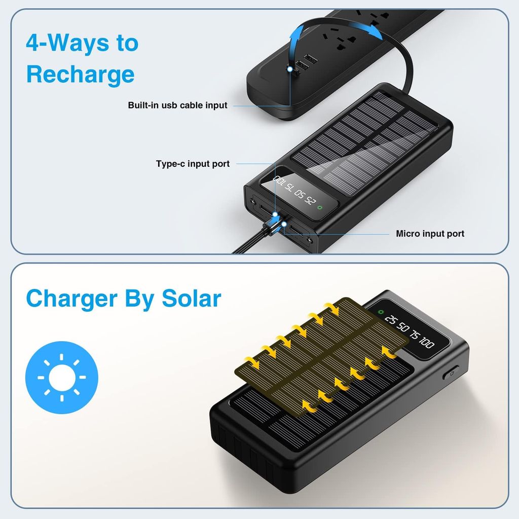<p>Virtapankki voidaan ladata USB-C:n, Micro-USB:n tai integroitujen aurinkopaneelien kautta, mikä mahdollistaa käytön myös ilman verkkovirtaa. Sisäänrakennetut kaapelit - USB-C, Lightning, Micro-USB ja USB-A - mahdollistavat useiden laitteiden lataamisen ilman lisäkaapeleita. USB-A-portti tarjoaa vakaan ja turvallisen latauksen, ja LED-näyttö näyttää selkeästi varaustason. Sisäänrakennettu LED-taskulamppu tekee siitä erityisen hyödyllisen retkeilyyn ja ulkoiluun.</p>